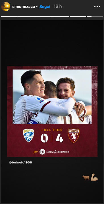 Anche se assente per un problema fisico (leggi qui), Simone Zaza si è comunque tenuto aggiornato sul risultato dei suoi compagni di squadra e si complimenta attraverso una storia su Instagram.