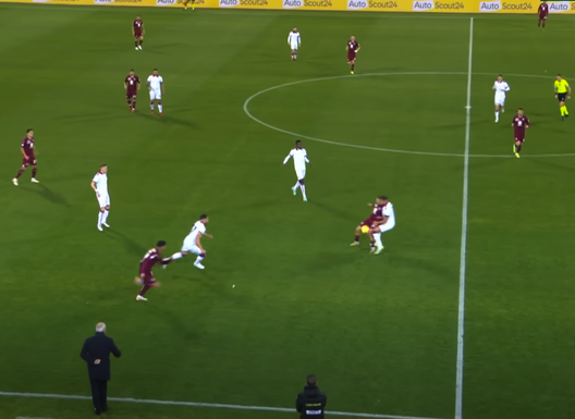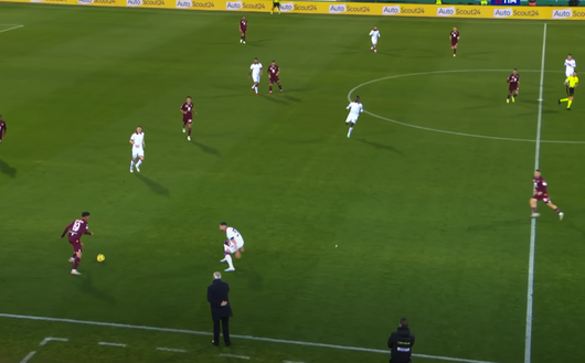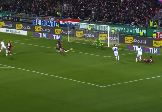 Vede Vlasic che praticamente coi piedi sulla linea di centrocampo si smarca e gli si avvicina. Bellanova allora gli chiede l'uno-due che il trequartista croato chiude con qualità e con un bel filtrante che mette in moto il numero 19 granata.