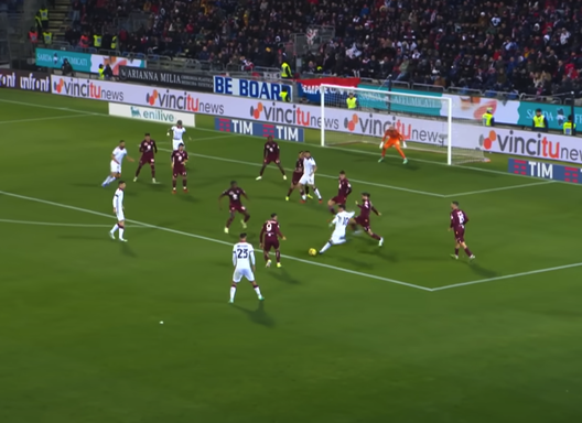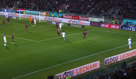 Il trequartista rossoblù entra in area e attira su di sé molti uomini della difesa granata che gli chiudono ogni spazio. L'unica soluzione per Viola rimane quindi tentare un tiro da posizione complicata. La traiettoria che parte dal suo piede mancino è perfetta e si insacca di poco sotto l'incrocio lasciando impietrito Vanja Milinkovic Savic,