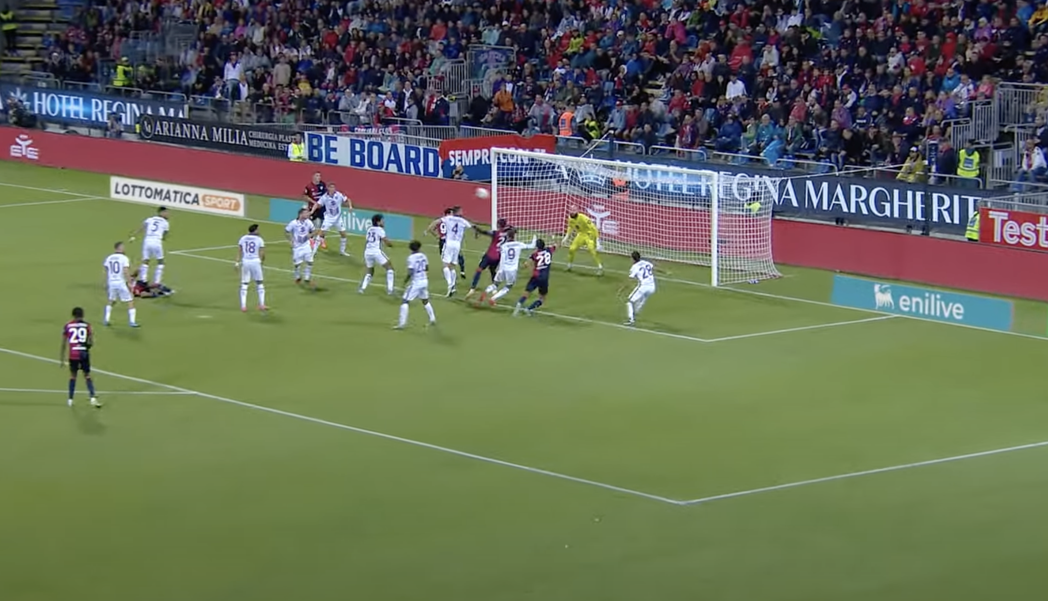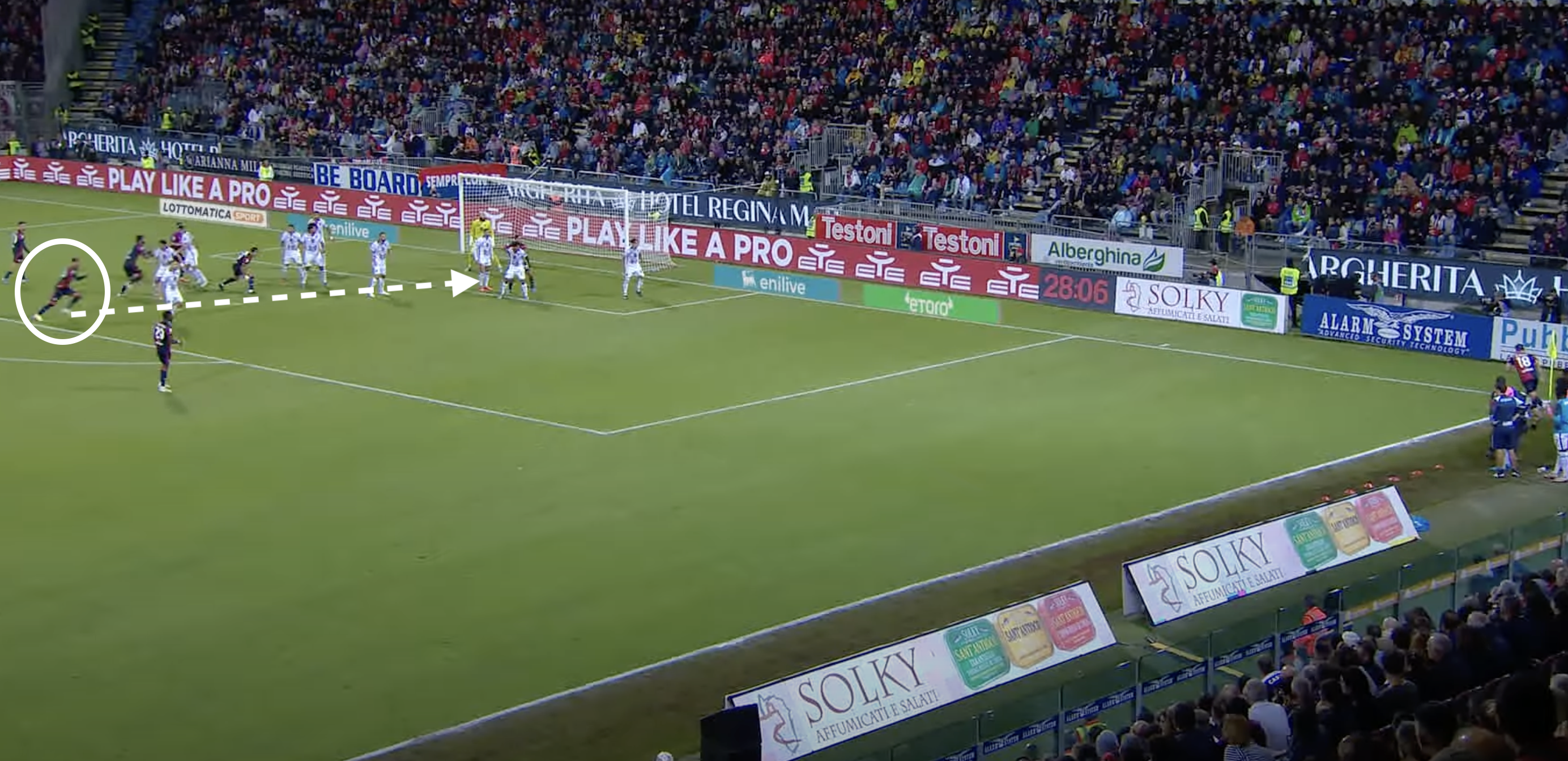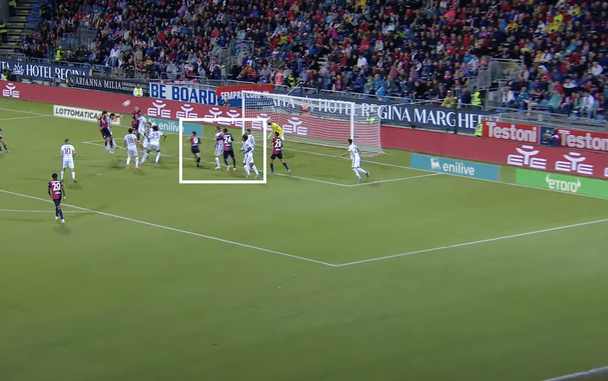 Il Cagliari pareggia i conti con uno schema preparato. Palomino (che poi segnerà) parte da lontanissimo (nell'immagine sotto potete vederlo quando è già partito e sta correndo verso il primo palo).