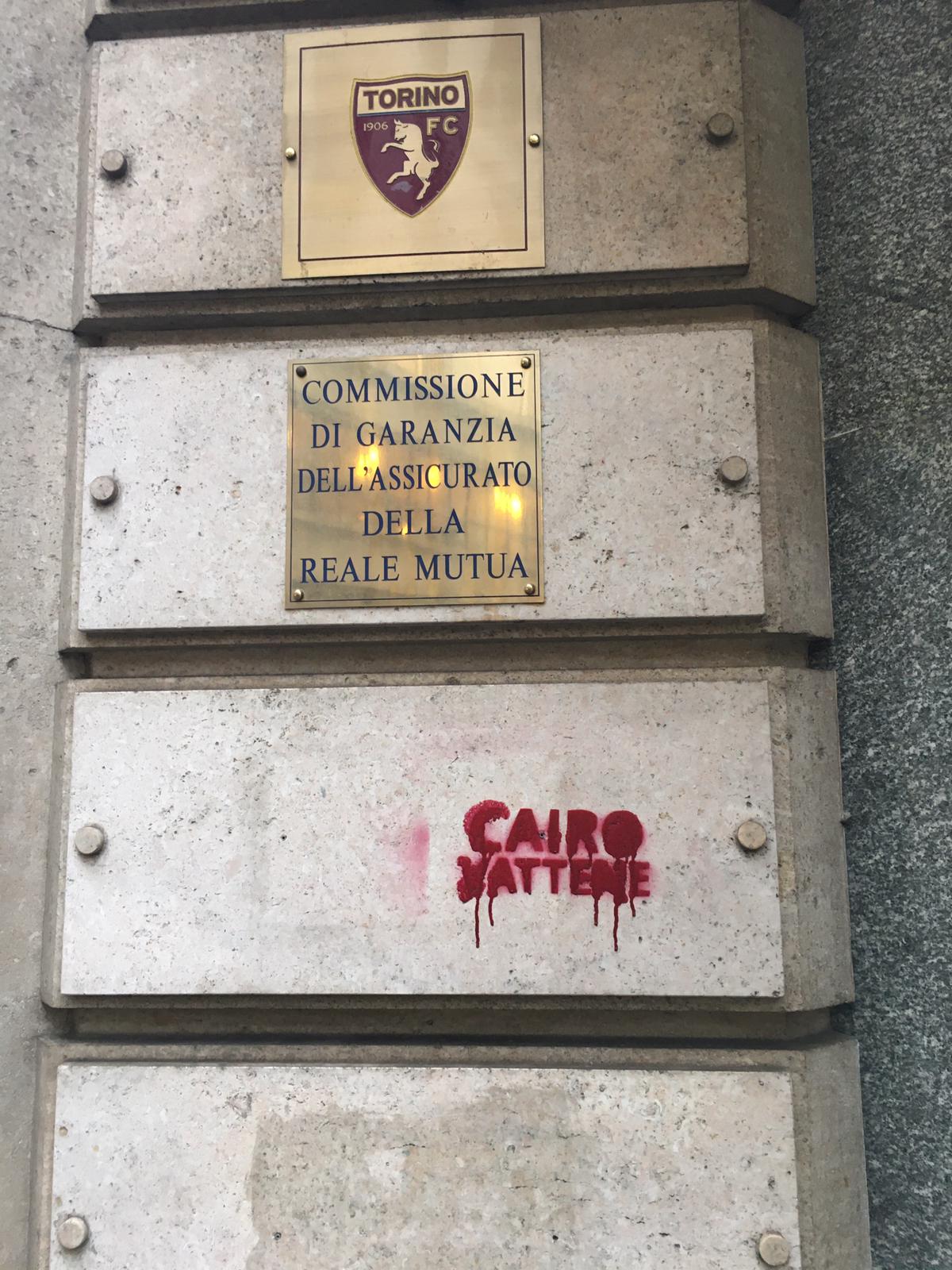 Ancora tensione nell'ambiente Torino. Scritte "Cairo Vattene" realizzate con uno spray di color granata sono state ritrovate questa mattina in via dell'Arcivescovado a Torino, vicino al portone del palazzo che ospita la sede societaria del Torino FC. Non solo: anche al Filadelfia, un cartello affisso sui cancelli dello stadio recante il Regolamento d'uso è stato imbrattato con una scritta: "Cairo Game over, vattene". Anche davanti al negozio della Joma, sponsor tecnico del Torino, sono state trovate scritte di contestazione nei confronti del patron granata. La vittoria di Brescia non ha placato il malcontento di una parte della tifoseria: ricordiamo che qualche giorno fa erano comparsi, in zona Lingotto, alcuni striscioni realizzati da ignoti e contenenti lo stesso messaggio. Continua dunque la contestazione verso l'operato di Urbano Cairo.