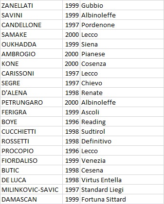 Questo è invece il tabellone dei giovani granata in prestito: