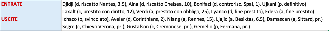 Questo è il tabellone definitivo del calciomercato granata, che nell'ultimo giorno ha definito le cessioni in prestito di Gustafson e Gemello e ha ufficializzato Ujkani e Verdi, che si aggiungono ai riscatti (Aina, Djidji, Bonifazi, Zaza e Ansaldi) e a Laxalt, arrivato il 31 agosto.