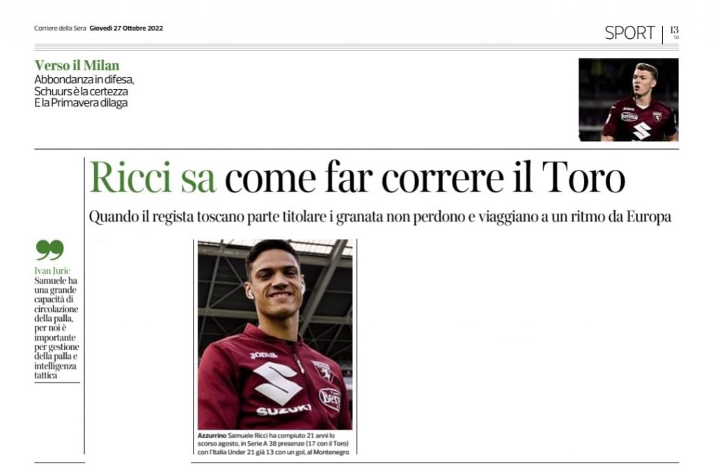 Il Torino a Udine ha rinunciato alla sua pressione altissima, che ad esempio a Napoli non ha pagato i dividendi, e ha puntato maggiormente sul palleggio. La tendenza è confermata anche da altre uscite nel corso della stagione e più in generale la metamorfosi è in atto da quando gioca sotto la Mole Samuele Ricci, il giocatore a cui Ivan Juric ha affidato le chiavi del centrocampo. Il Torino aspetta più basso per far fronte a una minor fisicità rispetto al passato e a un Bremer in meno nel cuore della difesa, l'unico in grado di poter duellare negli uno contro uno con tutti gli attaccanti della Serie A. Un atteggiamento simile richiede grande tecnica e qualità nel palleggio, soprattutto contro avversari forti come il Milan.