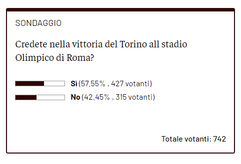 Come ogni settimana, Toro News ha proposto un sondaggio ai propri lettori: questa settimana, in vista della sfida di domenica - 28 novembre - contro la Roma, è stato chiesto se, secondo i votanti, il Torino avrebbe avuto qualche possibilità di successo contro i giallorossi. Contro ogni aspettativa, il risultato del sondaggio è positivo: il 57% dei votanti - che corrisponde a 427 su un totale di 742 - è fiducioso nel colpo del Torino sulla Roma, il che porterebbe i granata a mettere fine alla striscia di sconfitte consecutive in trasferta. D'altro canto, non manca chi non crede ancora totalmente nella formazione di Juric: per il 42% dei votanti - 315 voti - la trasferta di Roma non si rivelerà un successo. Due pareri molto contrastanti tra di loro, ma soltanto uno verrà confermato dai granata al termine della sfida.