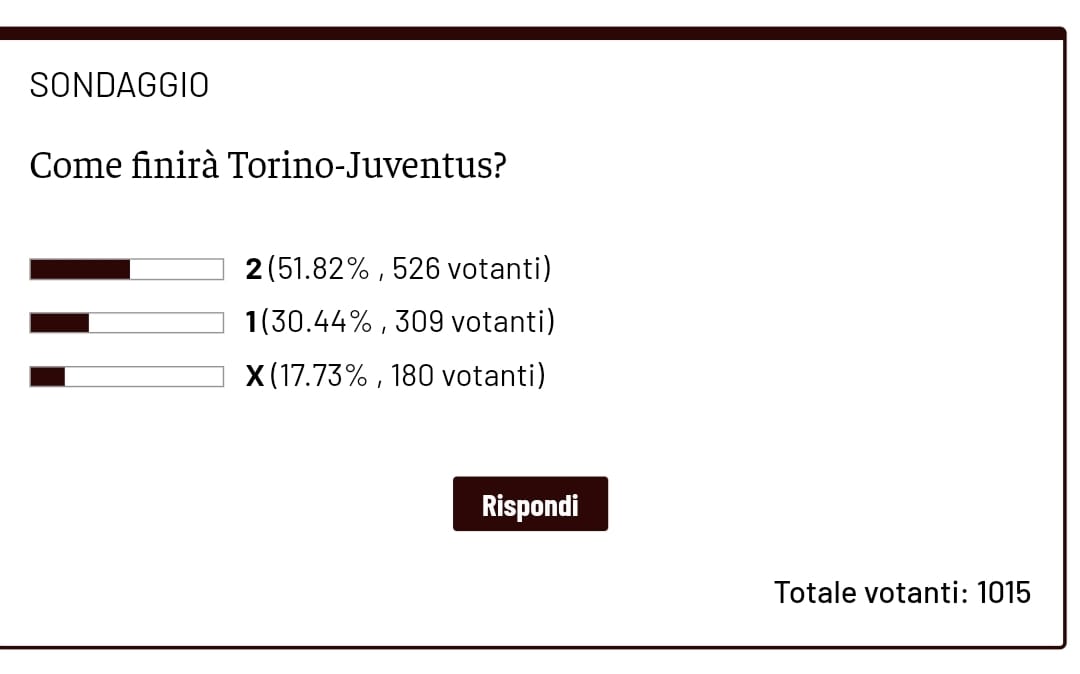 Ventiquattro ore esatte al fischio d'inizio del derby della Mole. L'attesa è alta per la sfida più sentita, presentata oggi dagli allenatori Juric e Allegri nelle rispettive conferenze stampa. Il Toro vuole riprendere la corsa per continuare a inseguire il sogno Europa e ambisce a regalare il successo nel derby ai tifosi granata in un Olimpico Grande Torino sold out. La Juventus d'altro canto ha come obiettivo ritornare in Champions League e ha il terzo posto da difendere. Ma come finirà il derby della Mole? Lo abbiamo chiesto ai nostri lettori nel sondaggio di Toro News. Prevale lo scetticismo tra le fila dei votanti. Il 52% dei lettore infatti crede che alla fine a spuntarla sarà la Juventus con una vittoria mentre i granata raccoglieranno il secondo ko consecutivo. Il 30% invece dà fiducia al Toro di Juric e scommette sul successo granata tra le mura casalinghe. L'eventualità meno quotata secondo il sondaggio è il pareggio, su cui punta invece il restante 18% dei lettori.