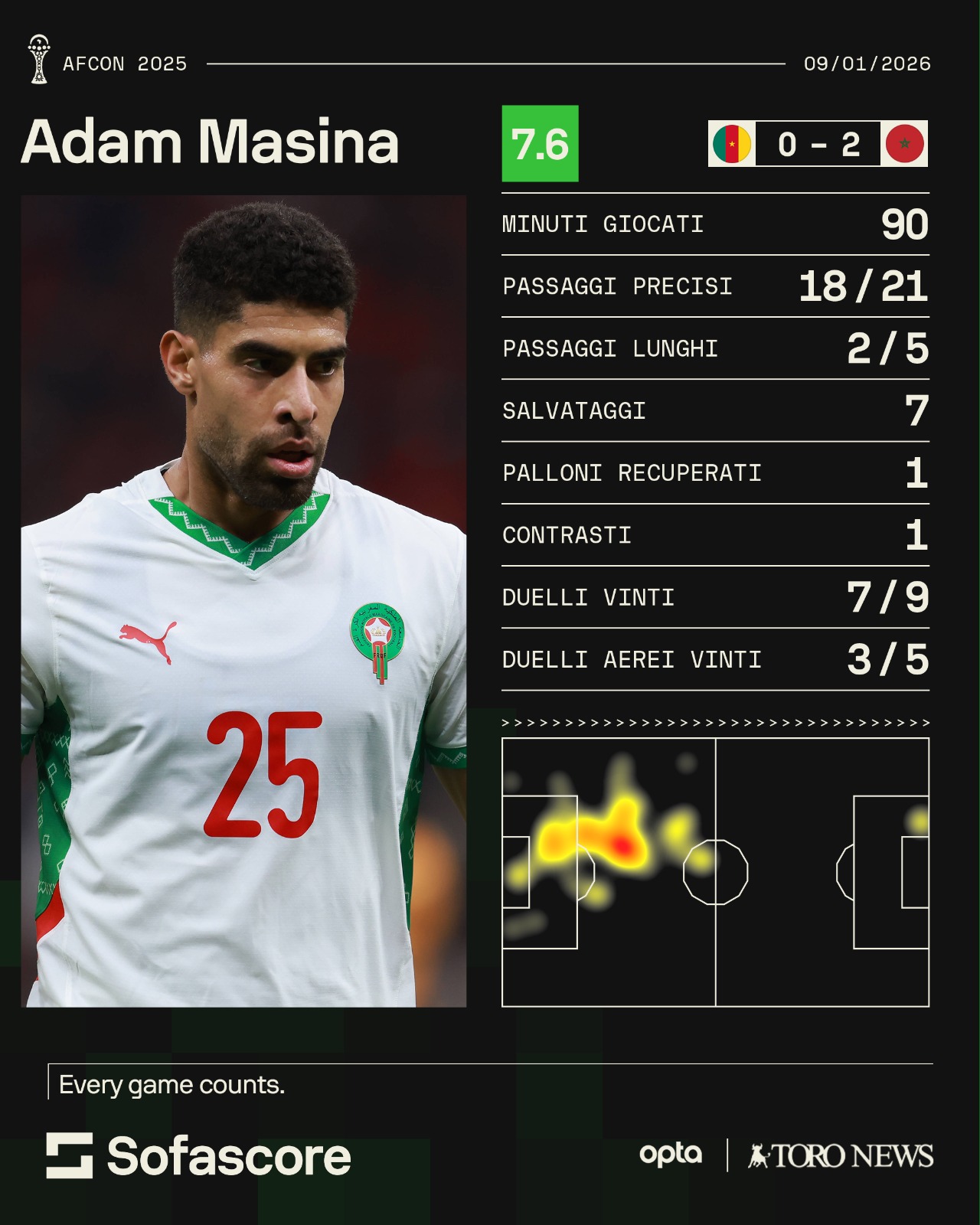 Vittoria importante, sentita e che significa tanto: con questo 2-0 rifilato al Camerun, il Marocco attende la vincente di Algeria-Nigeria in semifinale - in programma per il 14 gennaio - e inizia già a sognare l'ultima fase della Coppa d'Africa casalinga. La formazione allenata da Walid Regragui si è presentata al torneo come una delle favorite, e finora non ha disatteso le aspettative: Masina e i suoi compagni hanno reso alla grande. Anche questa sera, contro una formazione che ha stupito come il Camerun, il Marocco ha eseguito il compito richiesto: mirare, attaccare e vincere. La rete di Díaz nel primo tempo e quella di Saibari nella ripresa sono bastate agli uomini di Regragui per raggiungere la penultima fase della Coppa d'Africa, contribuendo alla grande gioia degli spettatori presenti al Moulay Abdellah di Rabat. Ma come ha giocato il difensore granata?