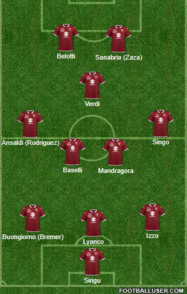 Un'ulteriore strada è invece quella che porta al 3-4-1-2. Nessuna novità ovviamente in difesa con Sirigu, Izzo, Lyanco e Buongiorno a comporre il pacchetto difensivo. A centrocampo i soliti Singo e Ansaldi sugli esterni, con Baselli e Mandragora ad agire da interni di un centrocampo a quattro. Con questa disposizione in campo troverebbe spazio anche Verdi, favorito rispetto a Gojak per il ruolo di trequartista alle spalle del duo composto da Belotti e uno tra Sanabria e Zaza.