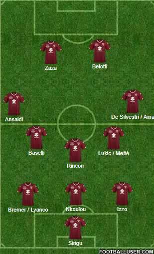 Un'altra possibilità è quella che porta al più "classico" 3-5-2. Un modulo che senza dubbio garantirebbe maggior peso al centrocampo, con la possibilità per Mazzarri di schierare tre mediani di ruolo tra Baselli, Rincon, Lukic e Meité. Da valutare l'intesa offensiva tra Belotti e Zaza, con la possibilità di vedere una delle due mezze ali ad agire tra le linee offensive in fase di possesso.