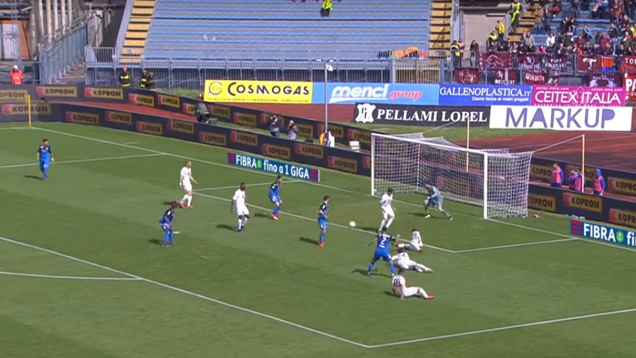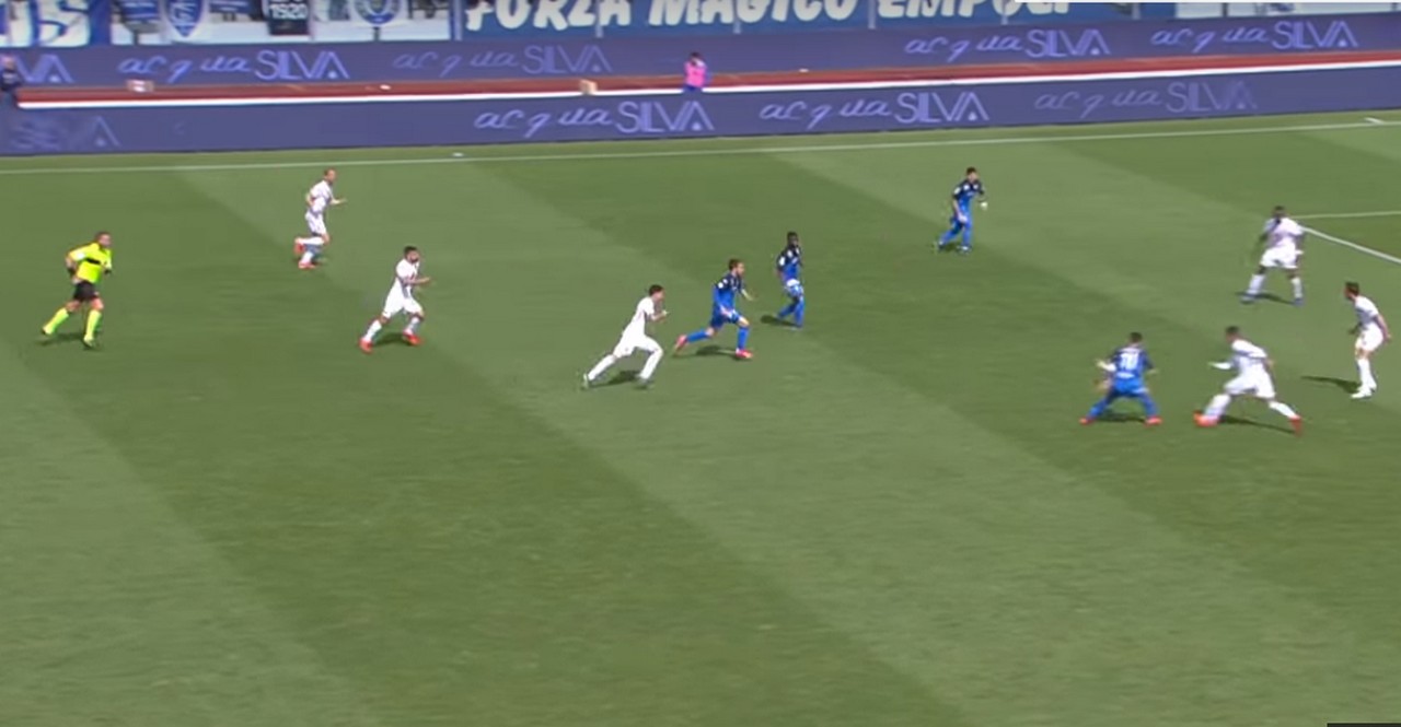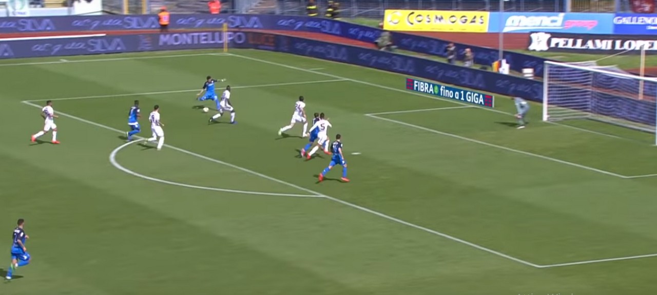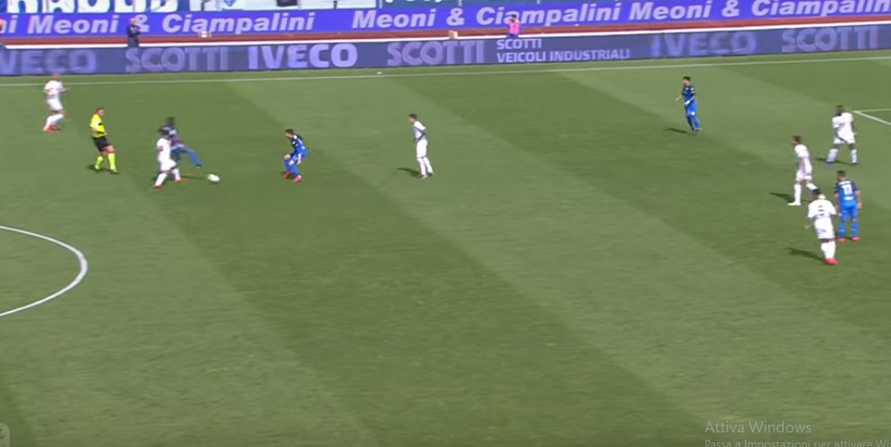 Qui nasce una bellissima azione dell'Empoli: Brighi, appena entrato, serve di prima Caputo, che ancora di prima torna da Traorè chiudendo il triangolo. Dall'immagine si vede lo scollamento tra difesa e centrocampo del Torino: l'Empoli punta l'area con quattro giocatori creando una situazione di superiorità numerica contro i tre difensori granata (Moretti, Nkoulou e Izzo).