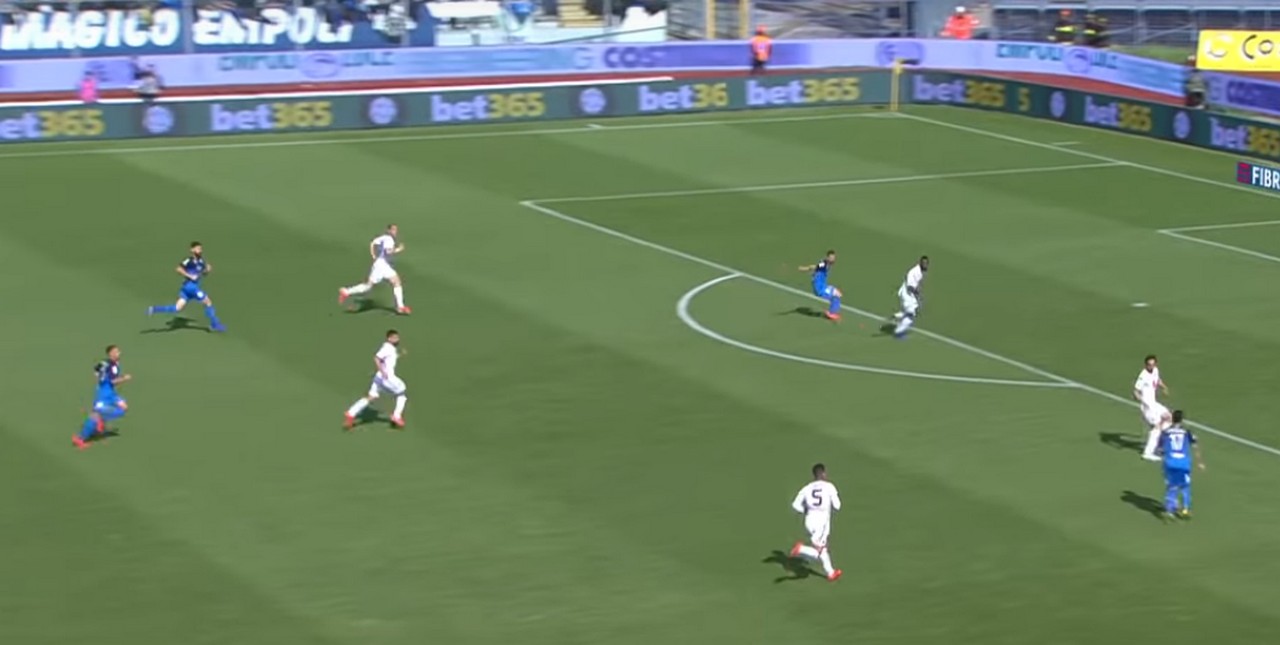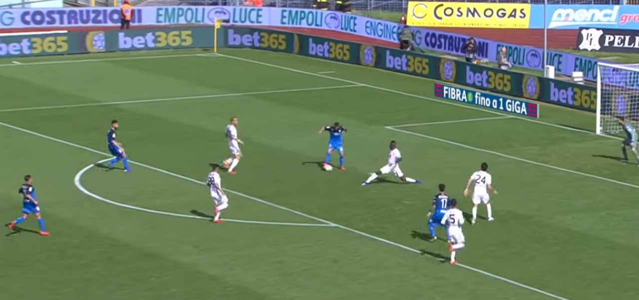 Il quarto gol dell'Empoli inferisce su un Toro ormai alle corde e sfilacciato. Bennacer avanza a testa alta e verticalizza per Farias. Il Toro è ormai scomparso e si crea situazione di due contro due: Farias e Caputo contro Moretti e Nkoulou.