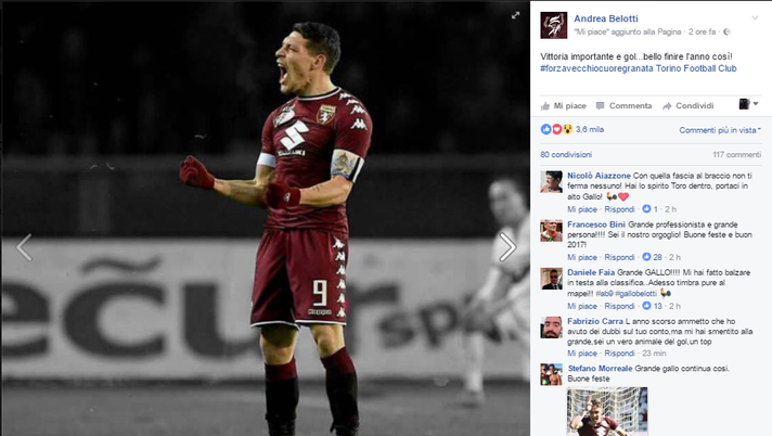 "Il Torino ieri ha sconfitto per 1-0 il Genoa grazie a una rete di Belotti concludendo al meglio il 2016. L'attaccante granata attraverso i social network esprime la sua felicità per la vittoria della squadra granata.