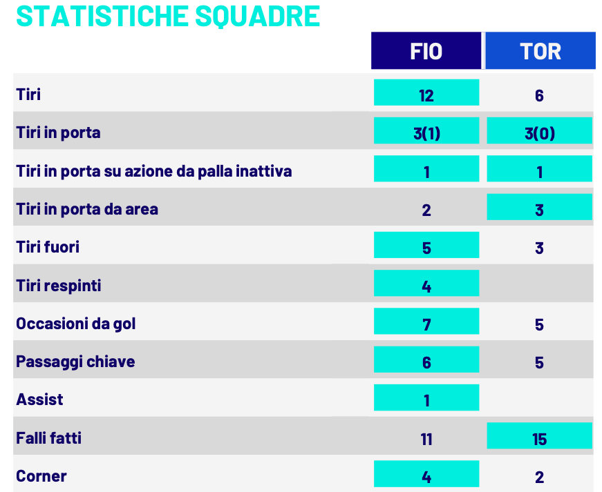 I toscani hanno creato di più secondo quanto si può vedere dalle statistiche. I tiri sono stati 12 per la Viola (di cui 3 in porta e 1 gol) mentre i granata ne hanno fatto la metà (di cui 3 in porta e 0 gol). Le occasioni da gol create sono state 7 per la Fiorentina e 5 per il Torino. I Gigliati hanno calciato 4 corner, mentre il Toro solo la metà (2). La formazione d'Italiano ha creato di più e nella ripresa ha avuto un atteggiamento più aggressivo spingendo il baricentro medio oltre la propria metà campo. Ricardo Rodriguez e compagni invece hanno creato ma non troppo, è prevalso un atteggiamento difensivista con un baricentro medio inferiore alla propria metà campo e la sconfitta è meritata.
