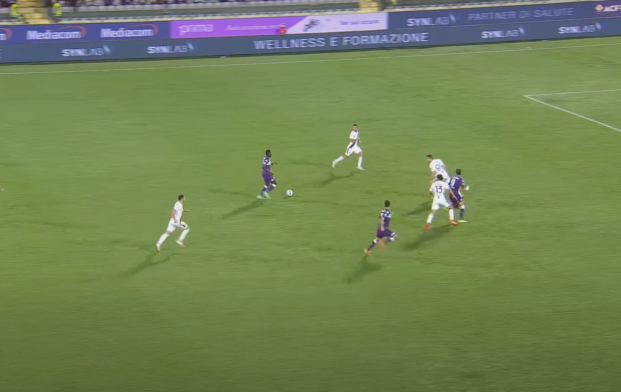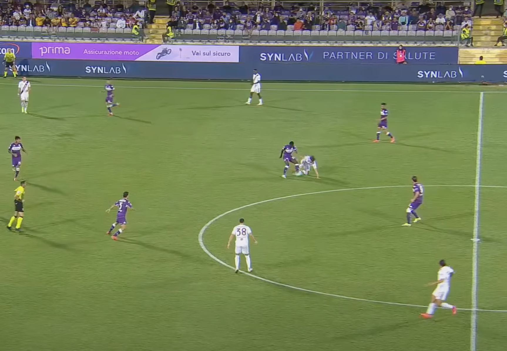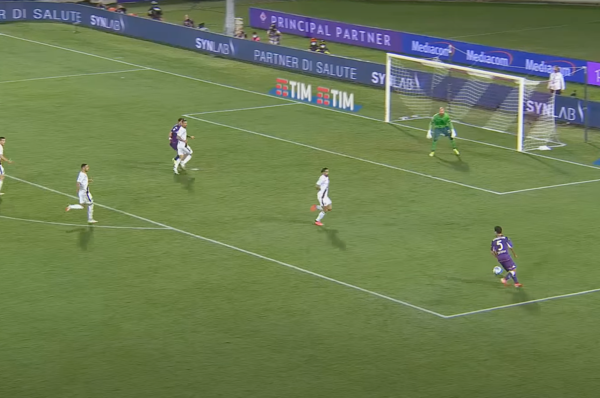Il centrocampista della Fiorentina allora allarga per Bonaventura scattato sulla destra. L'ex Milan va al cross. In area c'è il solo Vlahovic in partenza marcato da Izzo (Immagine 3).