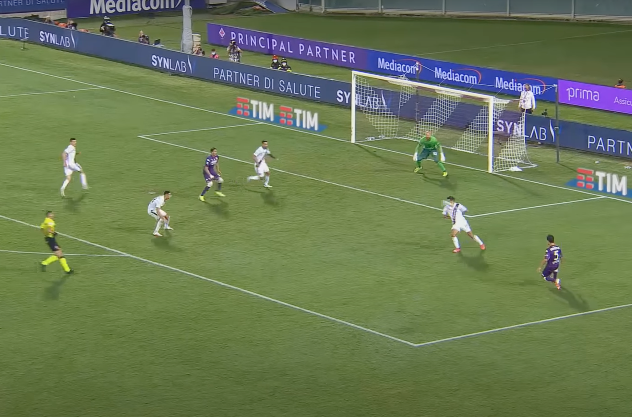 Al momento del cross, però, a Vlahovic basta fare un contro movimento per liberarsi da Izzo, essere completamente da solo e colpire indisturbato in porta (Immagine 4).