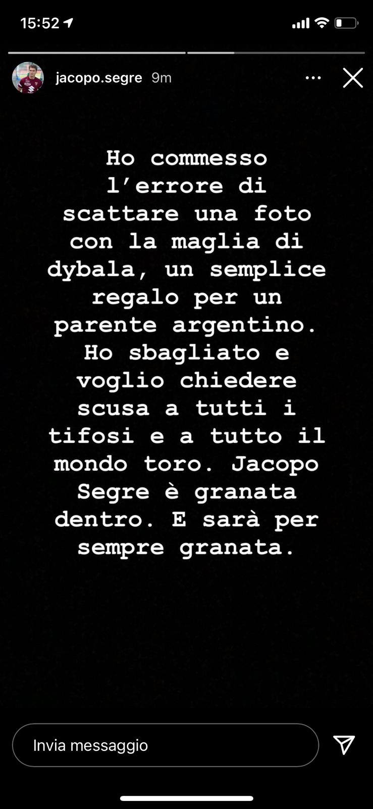 SEGRE - A dare spiegazioni in merito è stato lo stesso Segre, che tramite una story su Instagram si è scusato con chiunque si fosse sentito offeso: "Ho commesso l'errore di scattare una foto con la maglia di Dybala, un semplice regalo per un parente argentino. Ho sbagliato e voglio chiedere scusa a tutto il mondo Toro. Jacopo Segre è granata dentro e sarà per sempre granata". Malinteso immediatamente rientrato dunque, con il classe 1997 che ha voluto prontamente dare spiegazioni in seguito alla leggerezza commessa.