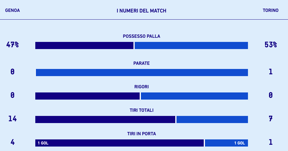 ATTACCO - Ben 14 i tiri del Grifone, sono metà quelli granata. I tiri in porta dei padroni di casa sono stati 4. Mentre gli ospiti hanno fatto solo un tiro in porta che è stato il gol di Sasa Lukic. Anche se dal punto di vista delle occasioni da gol le due formazioni si equivalgono (3). Pure i dati dei recuperi evidenziano che il Genoa ha creato di più. Glaison Bremer e compagni hanno dovuto effettuare 57 recuperi, contro i 42 dei liguri. Quest'ultimo dato si può spiegare sia con una maggior efficacia della linea difensiva granata ma anche perché la squadra di Giampaolo ha dovuto recuperare di più per difendere la mole di gioco superiore dei padroni di casa.