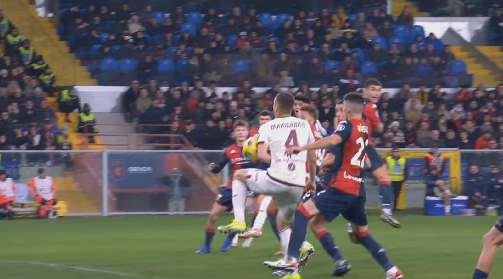 Si tratta dell'episodio più controverso all'interno di un primo tempo povero di emozioni. Contatto tra Djidji e Retegui, col granata che apparentemente stende l'attaccante del Grifone. Il direttore di gara fischia il fallo, scatenando le proteste del tecnico del Torino. Giua opta per l'ammonizione ai danni del mister granata, ma rivendendo il replay è evidente l'errore di valutazione dell'arbitro. L'attaccante italo-argentino scivola sul pallone. Giusti i gialli per Vlasic al quarto d'ora e per De Winter nel finale di frazione.Buongiorno e il giallo al minuto 81