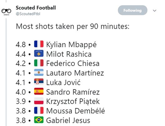 Analizzando altre voci dello studio di Scouted Football, si scopre che per tiri effettuati a partita il miglior Under 23 dei cinque maggiori campionati europei è Kylian Mbappe. Completano il podio Milot Rashica del Werder Brema e Federico Chiesa della Fiorentina.
