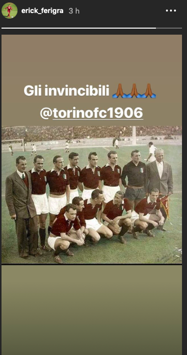 Anche Erik Ferigra ha postato una storia che ritrae una foto del Grande Torino in posa prima del inizio di una partita.