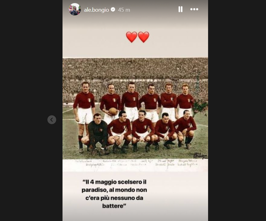 Alessandro Buongiorno - che questo pomeriggio leggerà i nomi degli Invincibili a Superga - ha postato una foto del Grande Torino sulle sue storie di Instagram scrivendo: "Il 4 maggio scelsero il paradiso, al mondo non c'era più nessuno da battere".
