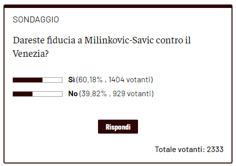 Visti i diversi errori caratterizzanti di Milnkovic-Savic contro Sampdoria, Sassuolo e Udinese (LEGGI QUI), ieri - mercoledì 9 gennaio - vi abbiamo chiesto, attraverso il sondaggio settimanale che proponiamo ai lettori di Toro News, se siete d'accordo nel dare fiducia a Vanja contro il Venezia. Su 2333 votanti, ben 1404 si sono schierati a favore del portiere serbo; al contrario, 929 voti sono stati assegnati per assistere a un cambio tra i pali nella partita di sabato sera contro il Venezia allo stadio Olimpico Grande Torino. Dunque, nonostante il girone di ritorno non è iniziato nel migliore dei modi per Vanja, i lettori di Toro News e i tifosi granata sperano di vedere al più presto il Milinkovic-Savic che si è visto nella prima metà del campionato di Serie A.