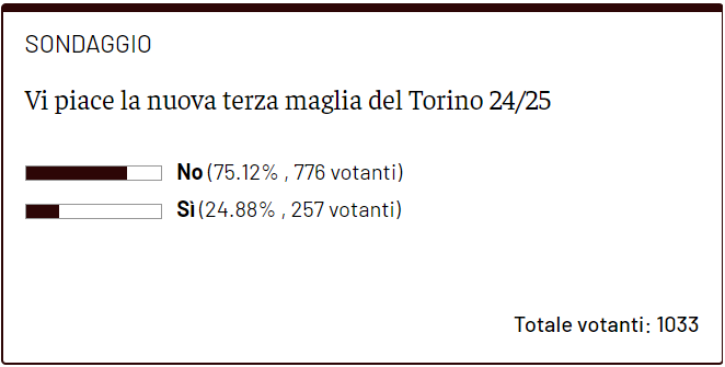 Nella giornata di ieri abbiamo posto su queste colonne una domanda a voi lettori sul gradimento della nuova terza divisa del Torino. Le risposte del sondaggio sono state molto nette perché oltre il 75% dei votanti ha espresso un parere contrario a questa maglia della squadra granata. Su un totale di 1033 persone che hanno espresso il loro voto a ben 776 non piace la terza maglia mentre l'hanno "promossa" soltanto in 257 che equivale a poco meno del 25%.