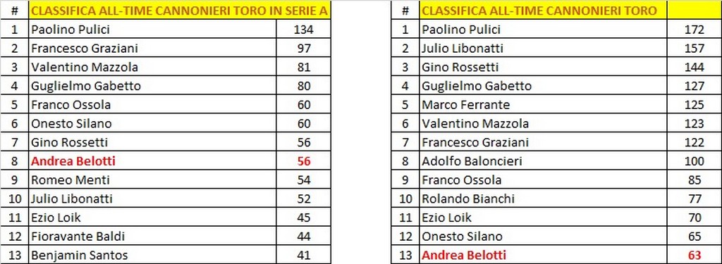 AD UN PASSO DA OSSOLA - Ottavo goal in questa stagione ma anche 56' goal con i colori granata in Serie A. Questi numeri lo portano in settima posizione per goal segnati da un granata di tutti i tempi nel massimo campionato, al pari di Gino Rossetti: per ora è inarrivabile Pulici, primo con 134 reti, ma nel mirino del Gallo ci sono Ossola e Silano, entrambi a quota 60. Nella classifica all time in ogni competizione (anche qui Pulici occupa la prima posizione), Belotti è 13° con 63 goal, due in meno del solo Ossola.