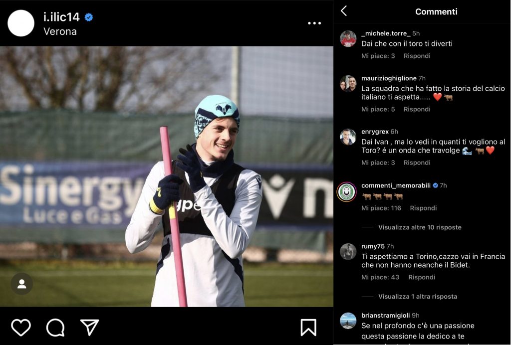 Dopo la cena di mercato col Verona alla presenza degli agenti di Ivan Ilic e Isak Hien, c’è grande attesa soprattutto in vista della decisione del centrocampista serbo, conteso da Toro e Marsiglia. E anche i tifosi del Toro, sui social, stanno cercando di contribuire, provando a convincere Ilic ad accettare l’offerta granata e tornare a lavorare con Juric. Come? Inondando di commenti l’ultimo post su Instagram del centrocampista del Verona.