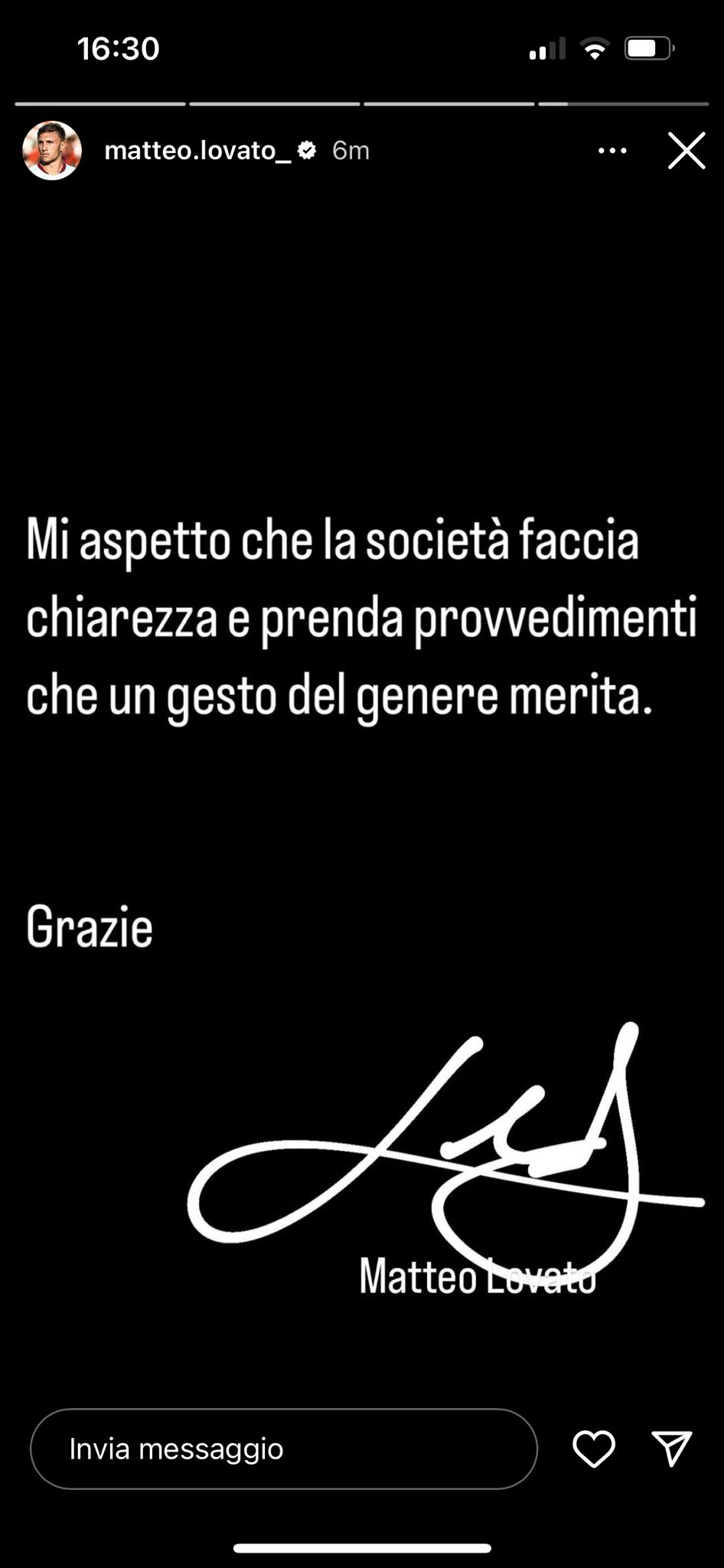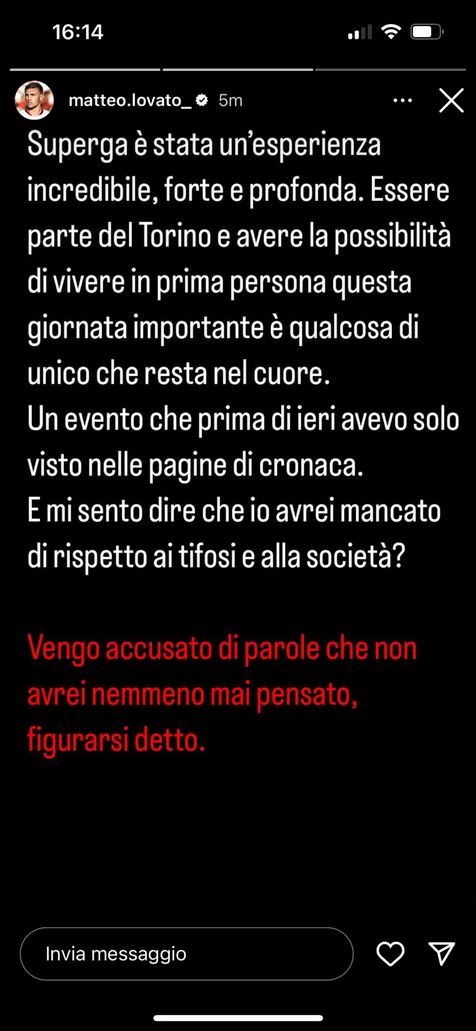 Dopo Pellegri, anche Matteo Lovato - tramite una storia Instagram - ha allontanato le accuse di insulti dal pullman ai tifosi granata: "Torino e il Torino FC sono la realtà più bella a cui mi sono affacciato da quando gioco a calcio. Ho iniziato ad amare il Toro da quando ho capito cosa significa rappresentare questa società. Chi mi conosce realmente sa il profondo rispetto e ammirazione, che ho sempre portato nella vita, a chiunque! E vengo pure accusato di aver detto qualcosa contro i nostri tifosi?. Non lo accetto, perché non fa parte della mia persona, ed contro i valori in cui credo!". Continua nella storia successiva il suo pensiero: "Superga è stata un'esperienza incredibile, forte e profonda. Essere parte del Torino e avere la possibilità di vivere in prima persona questa giornata è qualcosa di unico che resta nel cuore. Un evento che prima di ieri avevo solo visto nelle pagine di cronaca. E mi sento dire che io avrei mancato di rispetto ai tifosi e alla società? Vengo accusato di aver detto parole che non avrei mai pensato, figurarsi detto". E ancora: "Mi aspetto che la società faccia chiarezza e prenda provvedimenti che un gesto del genere merita. Grazie. Matteo Lovato".