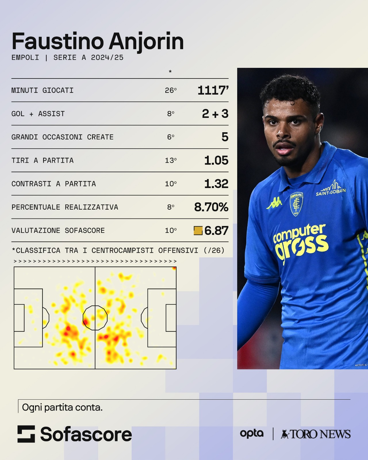 —"Abbiamo acquistato un giovane molto talentuoso che mi dicono faccia cose spettacolari, ho visto alcune partite e ricordo un gol bellissimo, alla Zola. È un ragazzo dal grande potenziale che spero possa sostituire Ricci nel modo migliore”, aveva affermato il presidente del Torino Urbano Cairo una volta giunta l’ufficialità del trasferimento. Una previsione che, col senno di poi, si rivelerà fallace, visto che si tratta di due giocatori con caratteristiche molto differenti, tanto da condurre la dirigenza negli ultimi giorni di mercato – e con il passaggio al 4-3-3 – a individuare un play come il toscano, prima nella risorsa interna Ilkhan, poi in Asllani dall’Inter. Di Anjorin si può parlare come di un giocatore box to box, dal fisico strutturato, le cui qualità tendono alla progressione e agli inserimenti. Le sue doti si sono già potute apprezzare nelle amichevoli estive. Il gol messo a segno da Gineitis nella prima amichevole col Monaco è nato da una sua giocata sull'out mancino: triangolazione con Lazaro, prima del cambio di passo che gli ha aperto la strada al passaggio per il lituano. Un lampo in cui ha abbinato dinamismo e abilità nel creare gioco. Poi il blackout collettivo di Valencia, in cui si è reso protagonista di una dormita sul primo gol dei padroni di casa e dell’espulsione che ha costretto i compagni a giocare la ripresa in dieci.