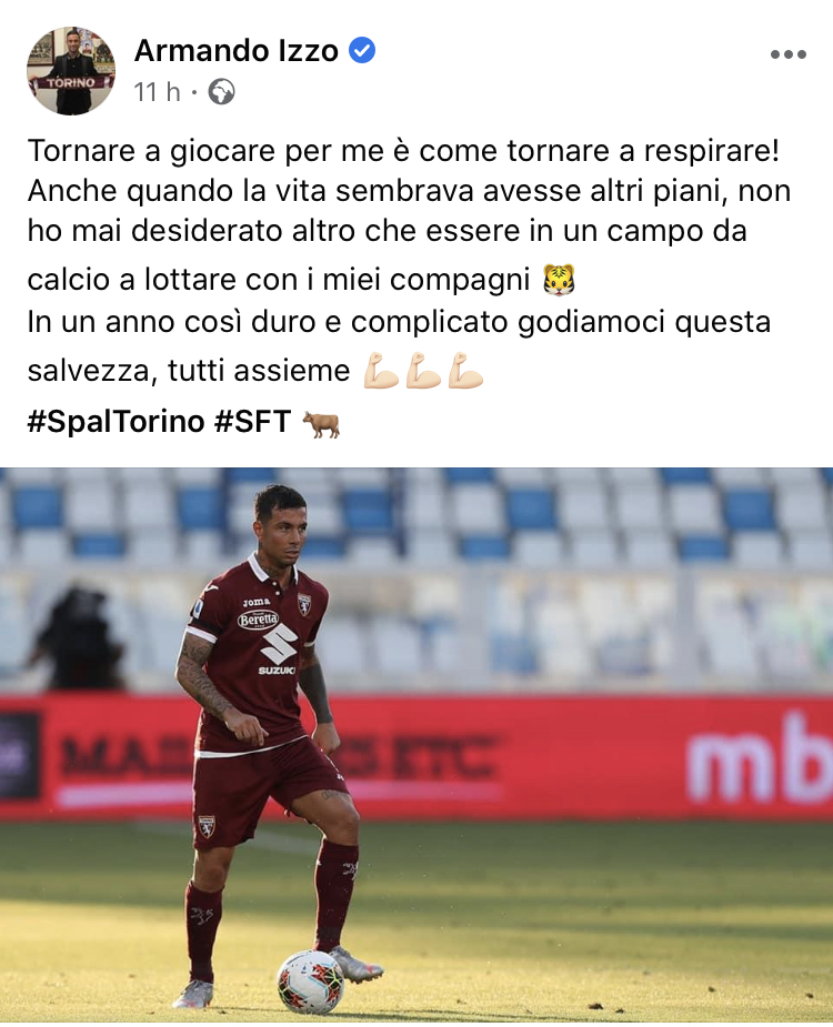 Armando Izzo è tornato titolare dopo diverse partite e ha diramato un messaggio su Facebook e Instagram: "Tornare a giocare per me è come tornare a respirare! Anche quando la vita sembrava avesse altri piani, non ho mai desiderato altro che essere in un campo da calcio a lottare con i miei compagni. In un anno così duro e complicato godiamoci questa salvezza, tutti assieme". Un messaggio che ha scatenato l'ira dei tifosi: in tanti hanno manifestato il proprio disappunto per le parole del centrale e per un annata che non ha rispecchiato le aspettative. I messaggi ricevuti hanno portato il difensore granata a rimuovere il post dal suo profilo Instagram (come era già successo in altre occasioni).