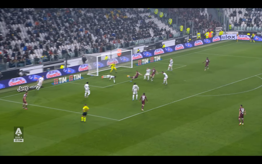 A questo punto Brekalo fa partire un preciso traversone verso il centro dell'area dove c'è Belotti che riesce a liberarsi della marcatura di Alex Sandro e al volo col mancino batte Szczescny (Immagine 5). In questo gol del Toro molti meriti vanno dati a Brekalo che è bravo a creare un'occasione da gol con un cross nato dal suo piede mancino nonostante lui sia un destro naturale. "Stiamo lavorando con Brekalo per renderlo più imprevedibile, in modo che possa andare sia sul destro che sul sinistro", ha detto Juric. Belotti poi si dimostra ancora una volta un grande centravanti che in area di rigore è sempre pericoloso e riesce a portare i granata al pareggio nel derby. Per il Gallo è il gol numero 108 in maglia Toro, per Brekalo il primo assist stagionale.