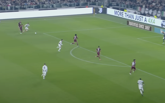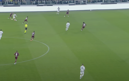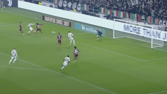 Ricci accompagna Cambiaso solo con lo sguardo. Per quanto molto veloce il terzino della Juventus, il regista granata avrebbe potuto essere più incisivo e deciso in chiusura, mentre ha lasciato tantissimo spazio al bianconero, che arriva indisturbato in area di rigore.