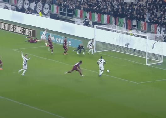 Entrano in area di rigore Cambiaso va al tiro. Da notare in basso che Lazaro - che stava seguendo Weah - perde il contatto visivo con l'avversario e si concentra sulla sfera.