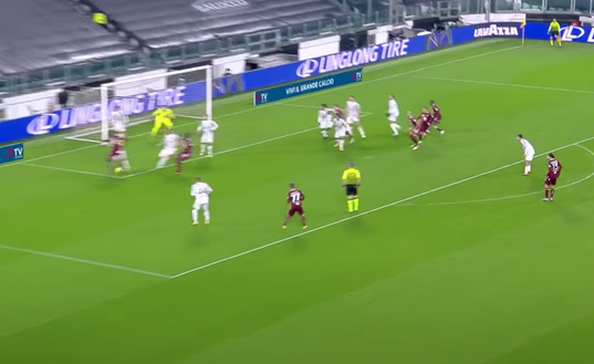 La deviazione del mediano bianconero sorprende Bonucci che era nei pressi e libera Nkoulou. Il difensore granata da solo davanti alla porta calcia d'esterno e non sbaglia. Palla in buca d'angolo e vantaggio Torino.
