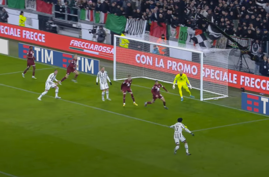 Al 15' la Juventus pareggia. L'azione dei bianconeri parte da una bella palla in verticale di Di Maria per Kostic.