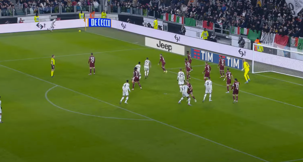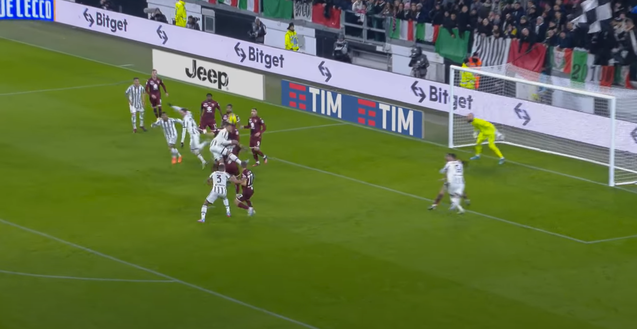 Nei minuti di recupero la Juventus pareggia i conti, questa volta con Danilo. I bianconeri colpiscono da corner. Tutti i giocatori di Allegri partono da dentro l'area, mentre Danilo parte da fuori.