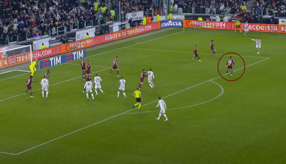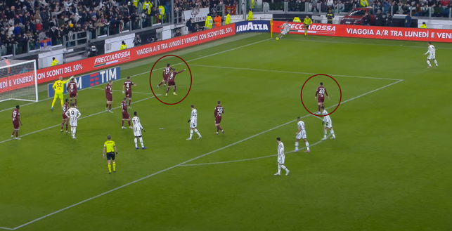 Il serbo rimane nella sua posizione, così a provare ad andare su Chiesa sono proprio Rodriguez e Ilic con una corsa disperata, ma il bianconero riesce a crossare indisturbato. Con il movimento dei due granata, in mezzo i granata sono scoperti.