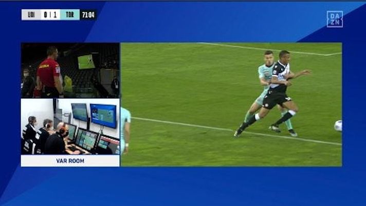 Al 71' l'episodio più strano e discusso del match. Doveri concede un fallo dal limite all'Udinese per un contatto tra Buongiorno e Becao. A questo punto interviene il VAR: il replay mostra che l'impatto si è verificato in area, tutti si aspettano che venga semplicemente indicato a Doveri che l'infrazione deve portare al rigore e non alla punizione. Invece, forse proprio perchè c'è in ballo l'assegnazione di un rigore, Doveri viene richiamato a valutare l'entità della presunta infrazione al monitor, con l'On Field Review. E' strano tuttavia che il VAR intervenga per far rivedere all'arbitro un contatto che lui ha visto e giudicato sul campo. Il risultato è una beffa per i padroni di casa: il contatto è in area ma non è falloso, si riparte con la rimessa dell'arbitro. E la scelta finale di Doveri convince: Becao sente il tocco e si lascia cadere, il rigore sarebbe stato ingiusto.