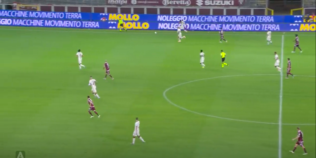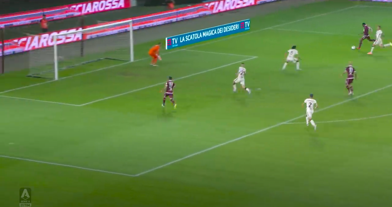 Goal alla Bruno Peres contro Bruno Peres: è proprio il brasiliano a subire la furia atletica di Singo, che si allunga il pallone sulla linea laterale e con una galoppata straripante lo svernicia. Non proprio semplicissimo, visto l'allungo del brasiliano.
