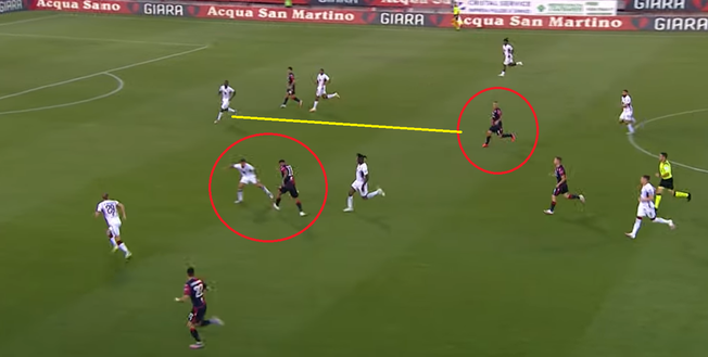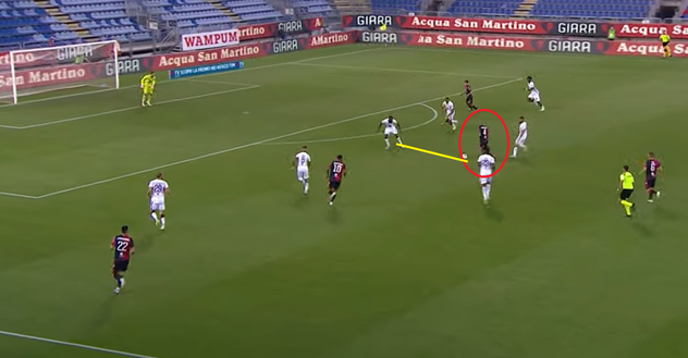 Il numero 10 dei rossoblu ha poi visto Nainggolan libero sulla trequarti, con Rincon in netto ritardo nella marcatura preventiva. Il belga ha avuto lo spazio per avanzare, mentre Nkoulou lo marcava a (troppa) distanza ma con qualche indecisione di troppo nell'accorciare.