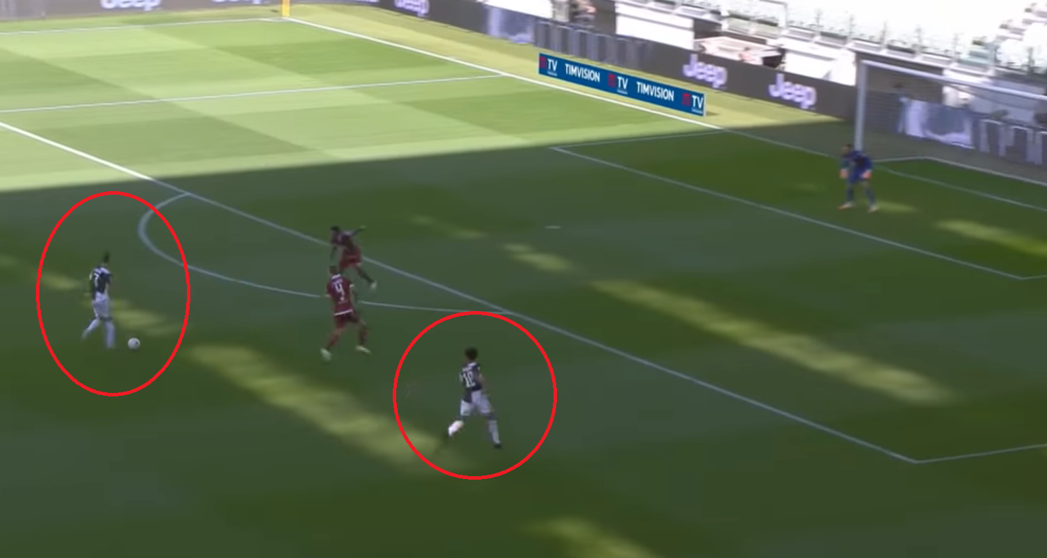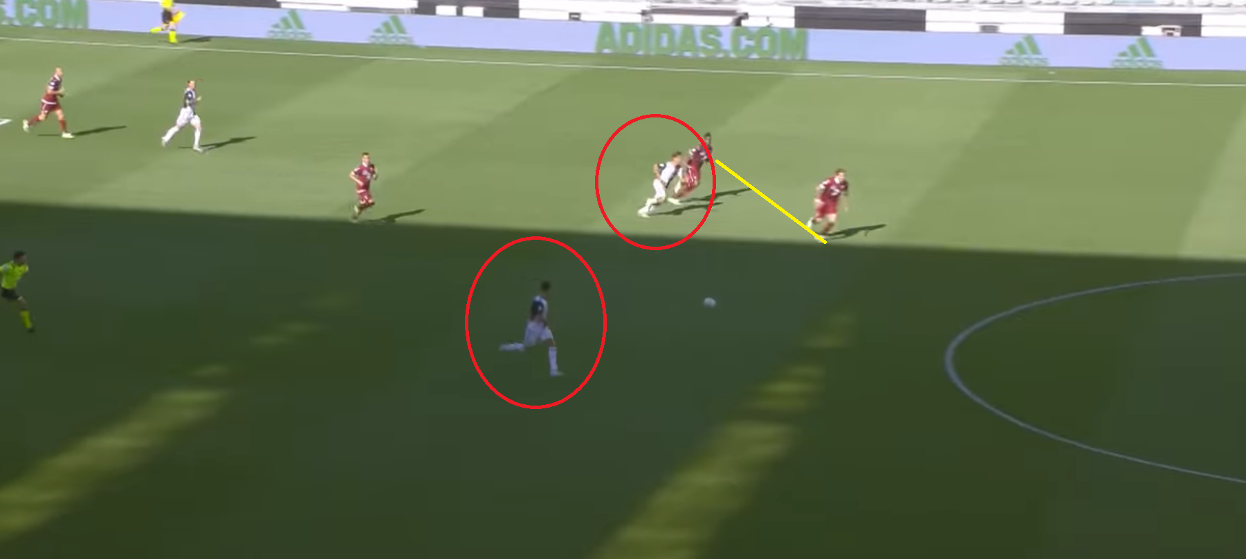 Troppo facile superare Lyanco, ancora una volta ingannato dalla finta dell'avversario: ottima la conclusione di Cuadrado, angolata, che ha battuto un incolpevole Sirigu. Ancora una volta però va sottolineata l'errata postura del difensore brasiliano, che concede il piede forte (il destro ndr) all'avversario.