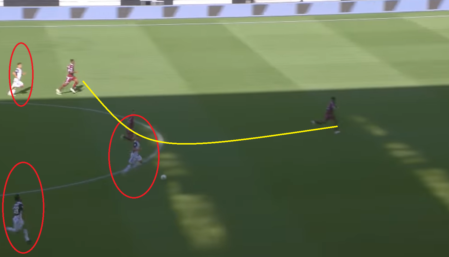 L'argentino è penetrato in area di rigore, superando Lyanco in maniera del tutto netta, mettendolo a sedere. Grave l'errore di postura del difensore granata che si è lasciato ingannare dalla finta dell'attaccante, estromettendosi dall'azione.