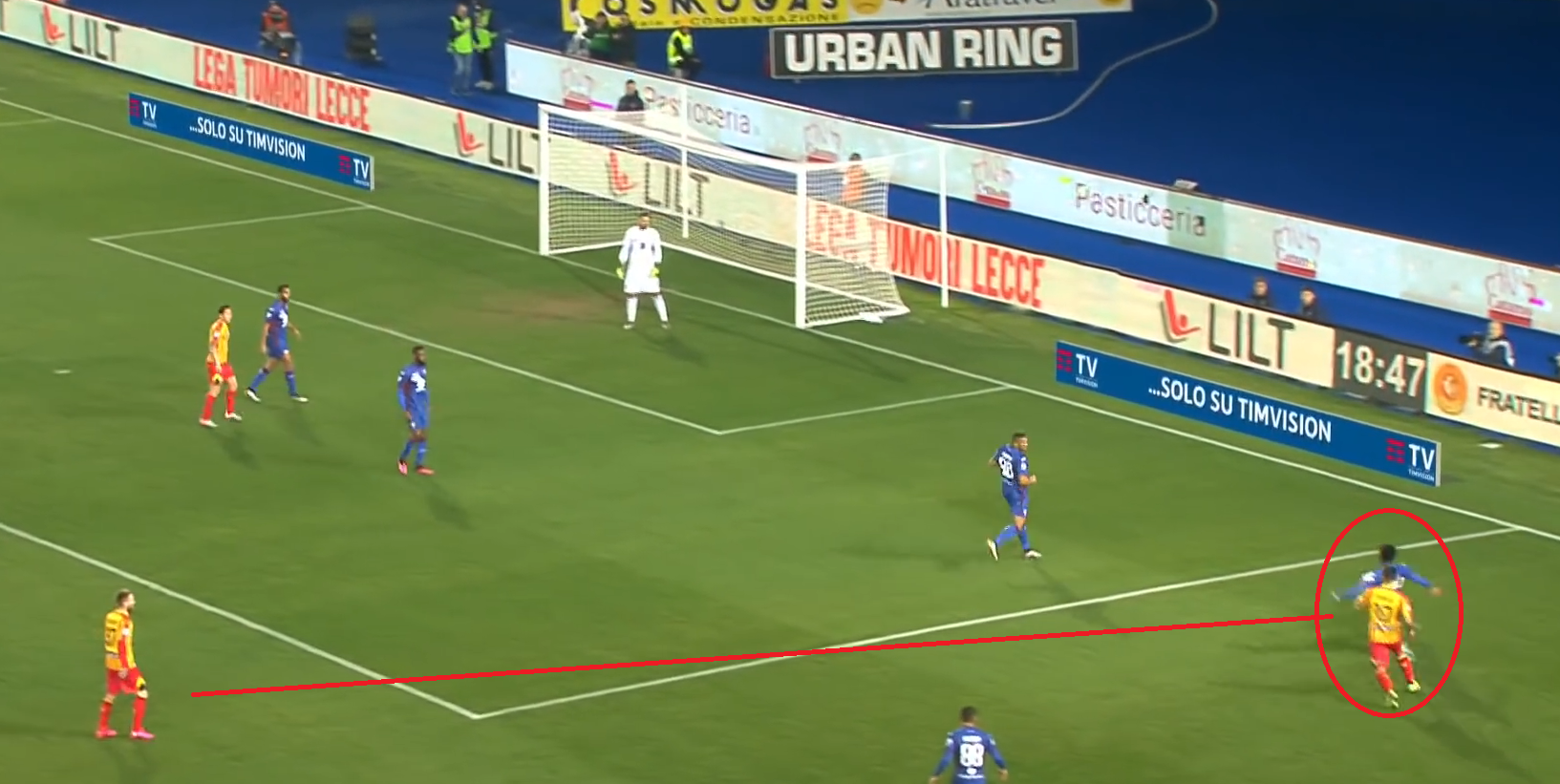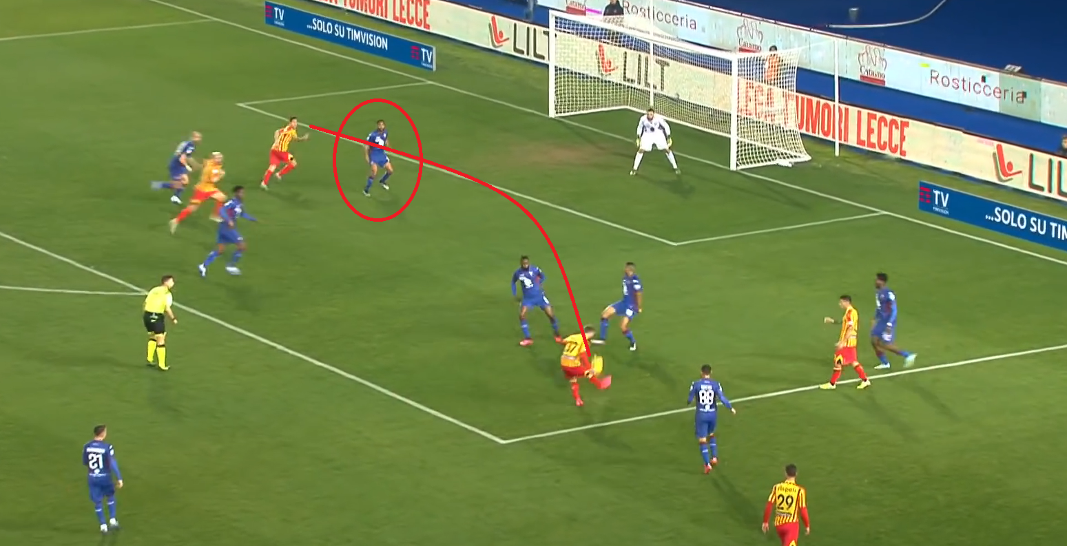 Di seguito è arrivato un altro cross in area, sul quale si vede che Djidji è ben piazzato davanti a Lapadula, pronto ad anticiparlo.