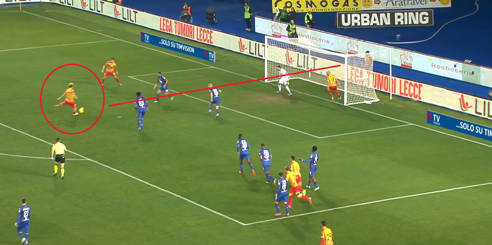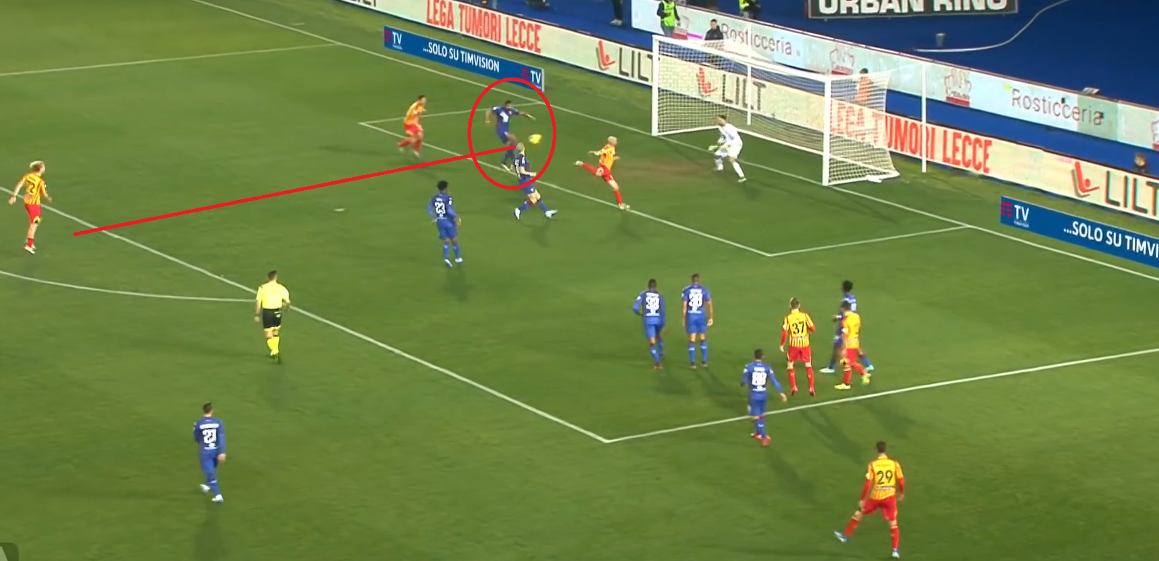 Si arriva poi al secondo gol dove ci sono ben due strafalcioni individuali inconcepibili Dopo una banale rimessa laterale, parte un cross in area che viene respinto e arriva di conseguenza sui piedi di Ola Aina. Il terzino aveva solo il compito di spazzare il pallone dalla zona calda, ma invece lo ha servito direttamente al Lecce tentando un rinvio al volo sbagliato nell'idea e nell'esecuzione.
