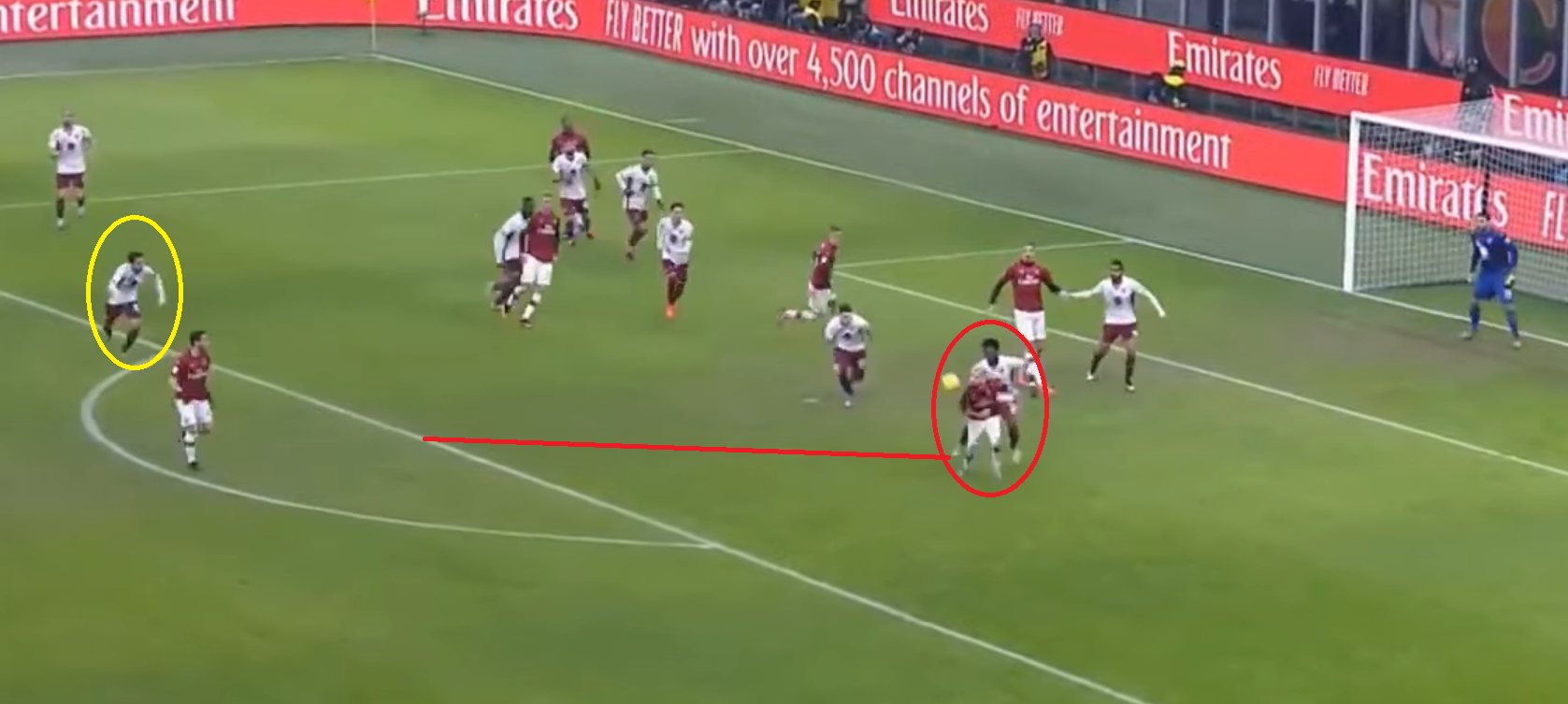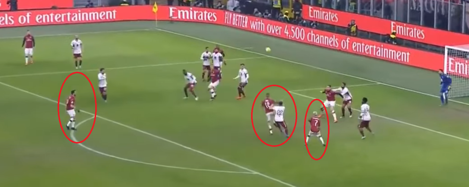 La rete che invece ha di fatto messo in ginocchio il Toro è arrivata proprio al 91', a quattro minuti dal fischio finale. Dopo molte azioni dei rossoneri, un cross viene spizzato verso Castillejo, che immediatamente nota l'assenza di marcatura di Calhanoglu.