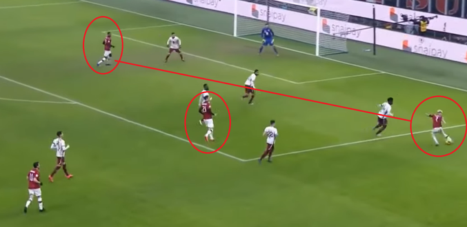 All'interno di essa, ma girato di spalle, c'è il nuovo entrato Leao, che decide di svolgere il ruolo di boa, servendo l'accorrente Ibrahimovic.
