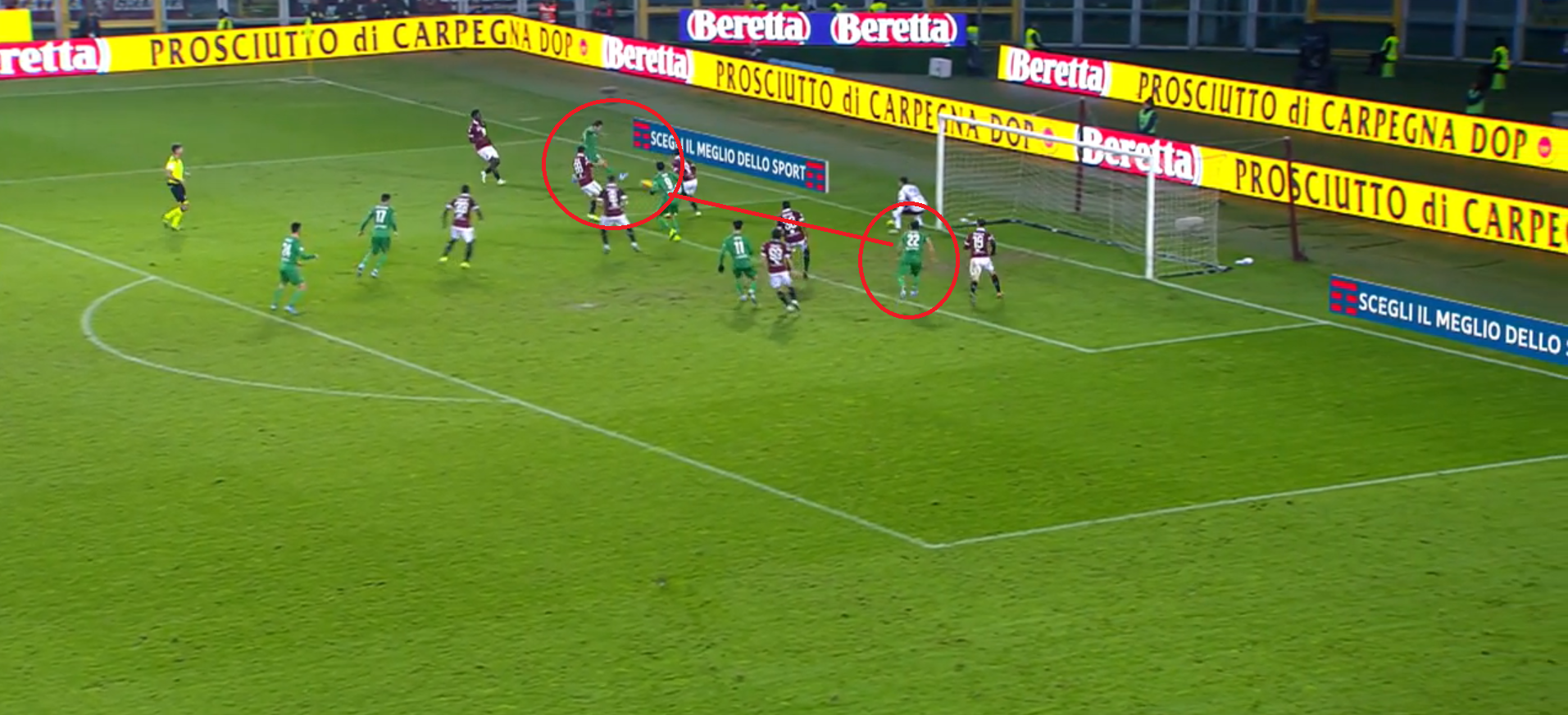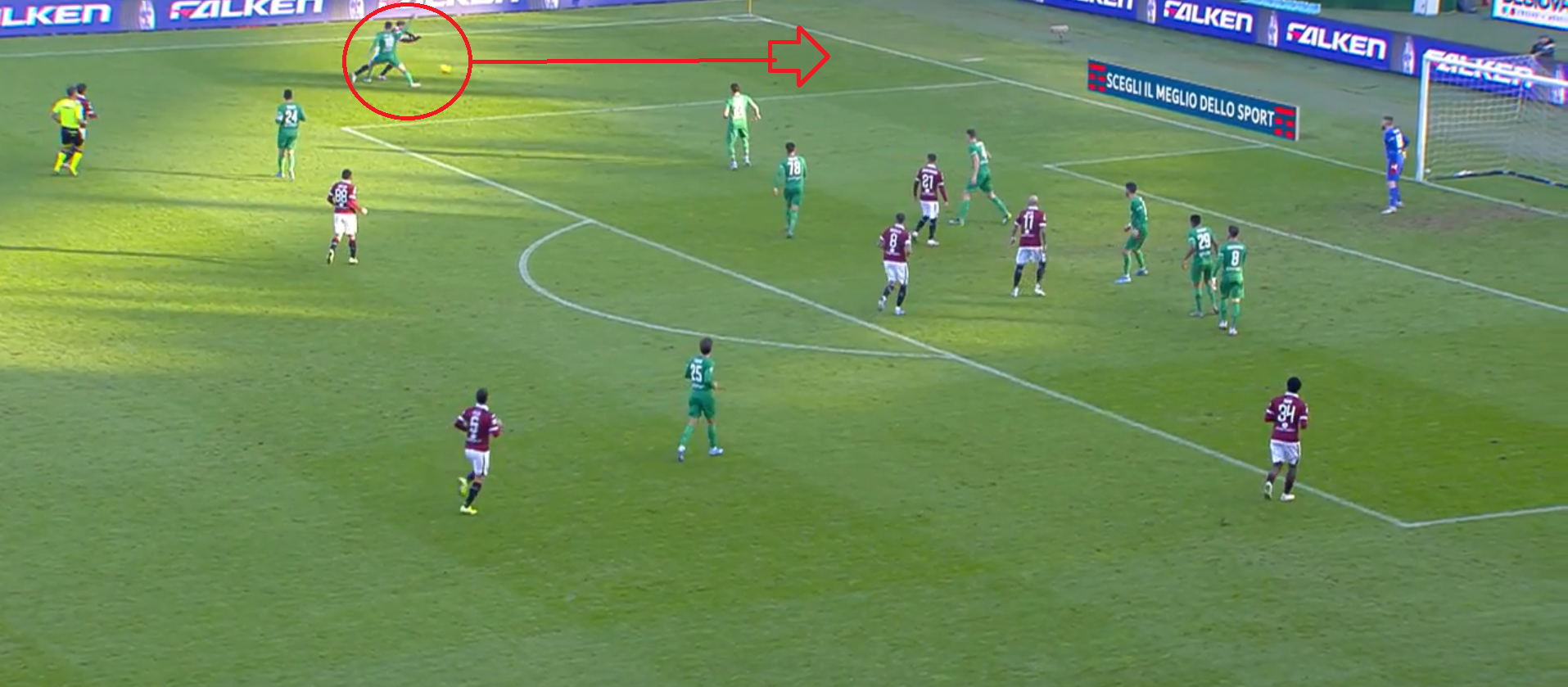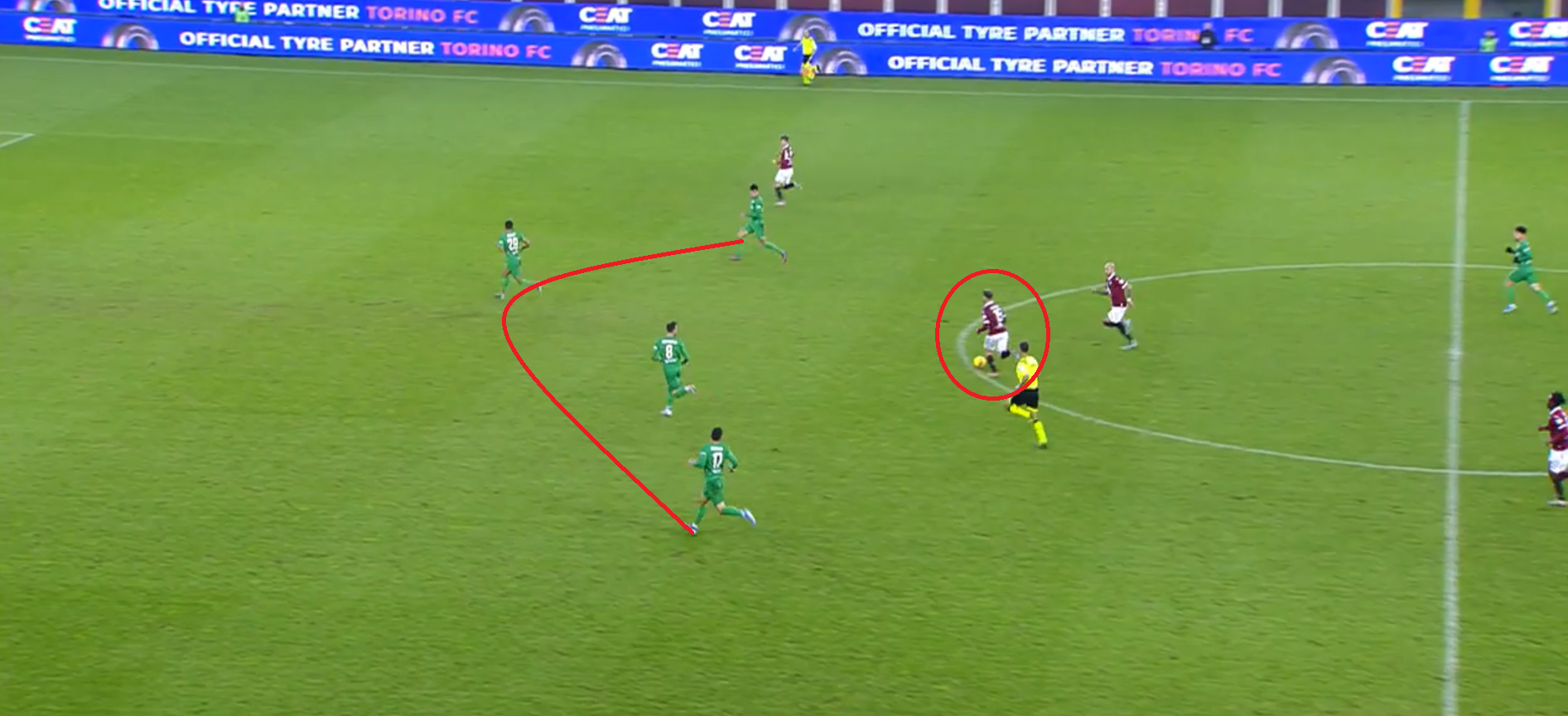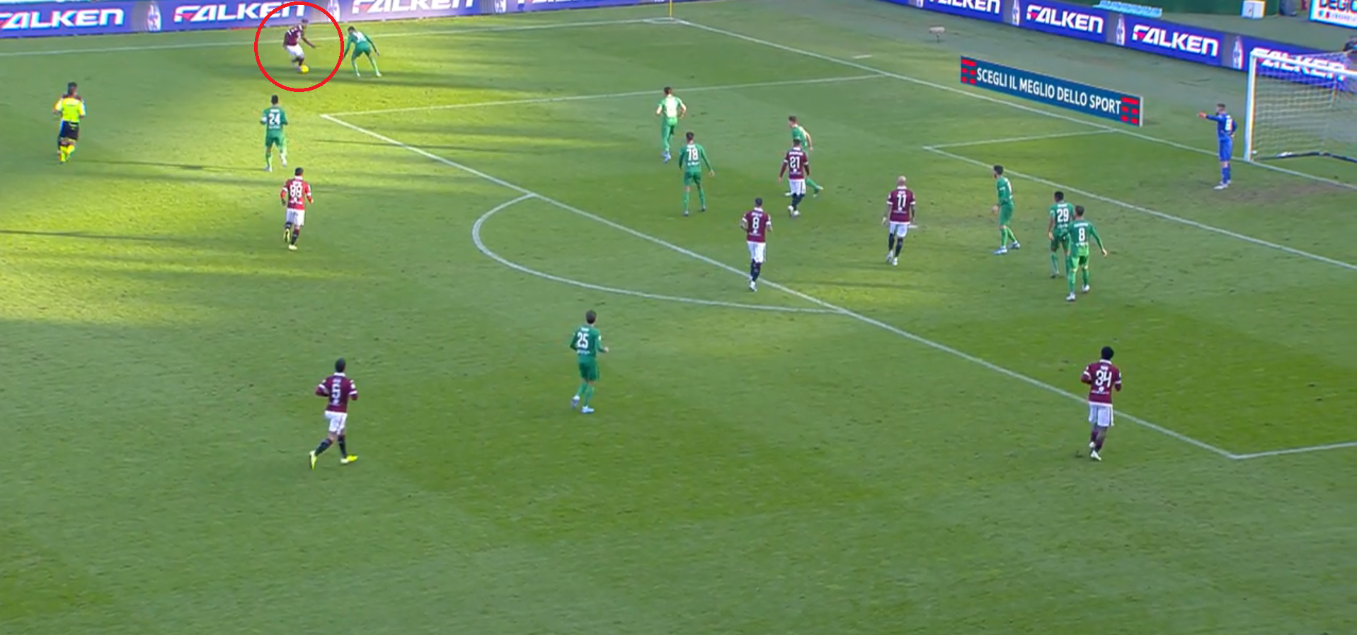 Andando ad analizzare la prima rete del Torino, si può notare come Ansaldi si sia mosso estremamente bene sulla sinistra: contro-movimento per liberarsi e andare sul fondo.