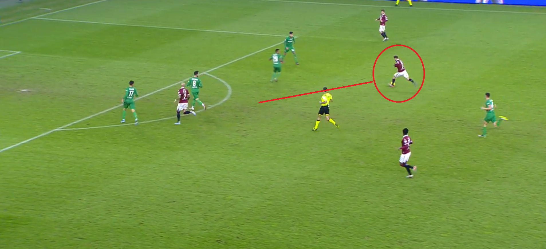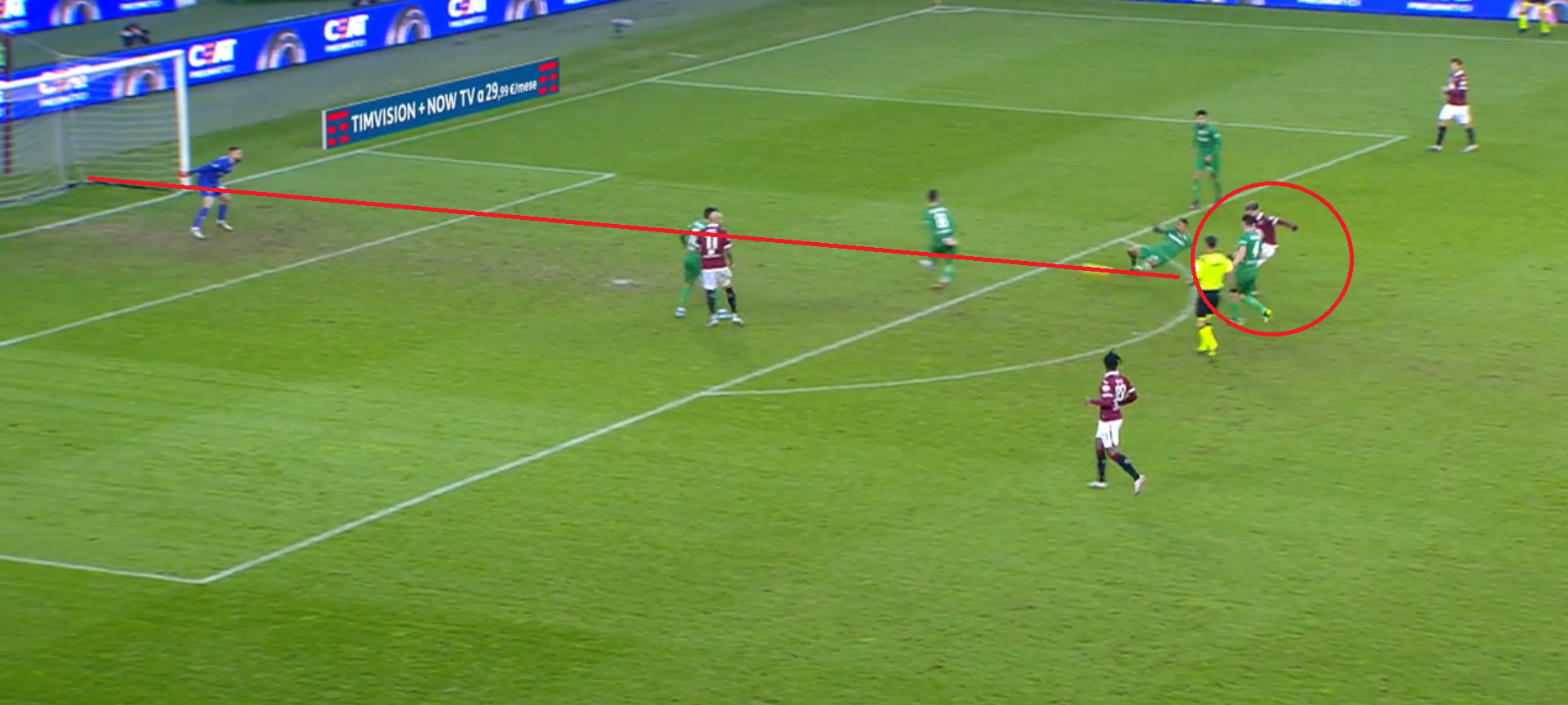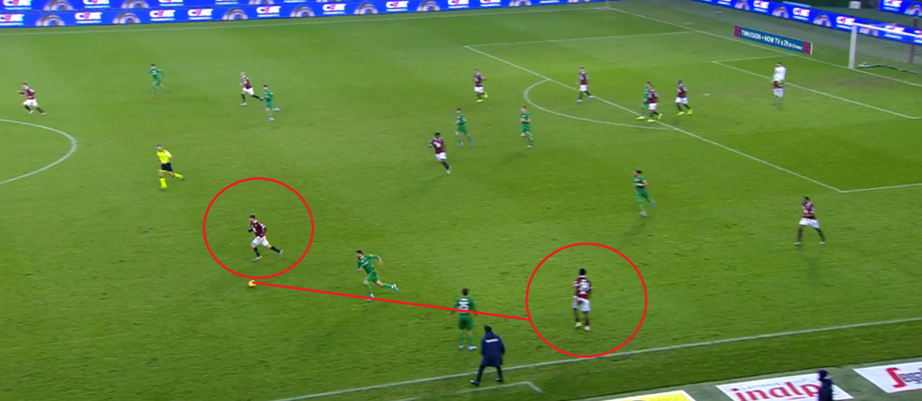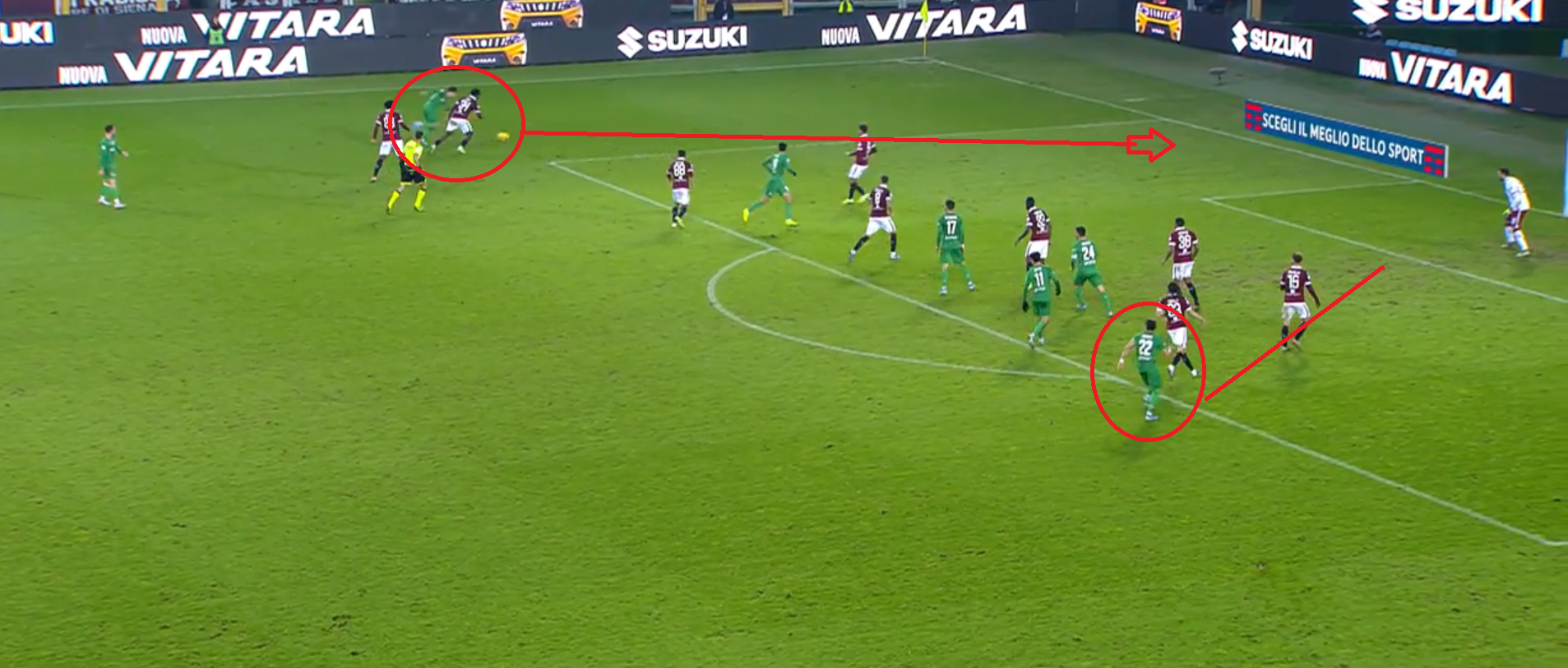 Andando ad analizzare la prima rete del Torino, si può notare come Ansaldi si sia mosso estremamente bene sulla sinistra: contro-movimento per liberarsi e andare sul fondo.